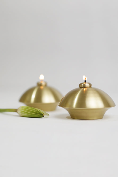 Move over candle lights, here comes the original – the Oil Lamp in its Sanchi Avatar. Inspired by the hemispherical domes of the stupas of Sanchi, our handspun oil lamps are meditative and aesthetic.The lamps are spun by hand out of copper and brass sheets. The fuel chamber can hold upto 25 ml of oil. Pour oil, insert wick and light the lamp and you’re good to go for two to three hours. Size: 4.25'' dia x 2.75'' ht