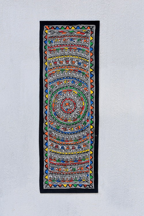 Godhna style multicolor design Handpainted Madhubani painting Wall Hanging, size 22.3 inches*7.5 inches