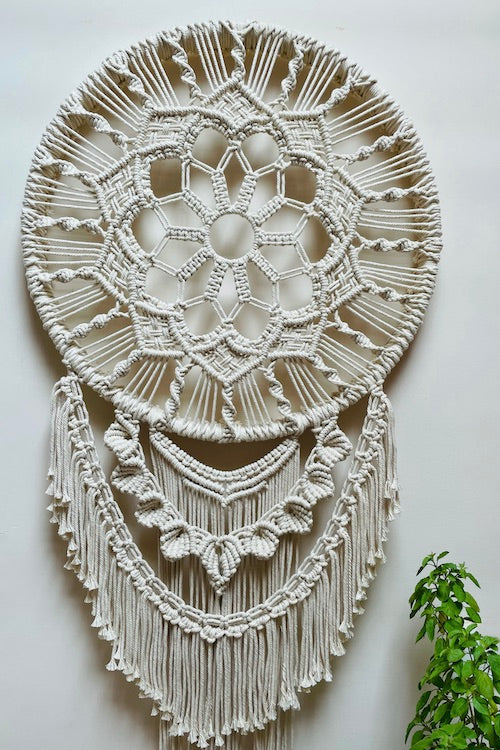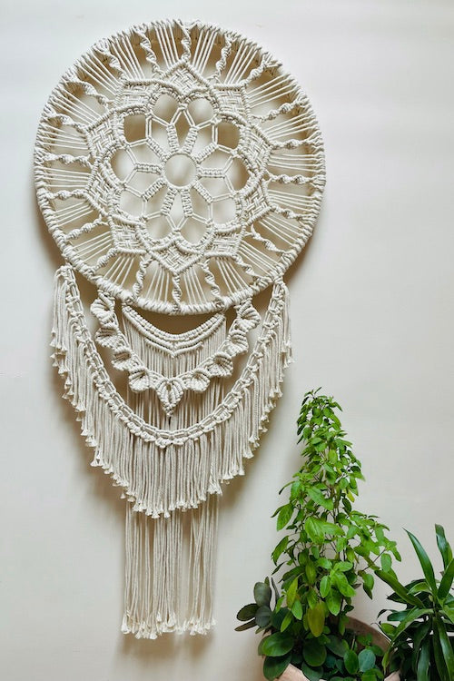 A dreamcatcher is considered a sacred hoop and keeps away bad dreams. Macrame dreamcatcher is made of biodegradable cotton thread. The product will add artist touch to your decor with its intrinsic design. Each knot is carefully crafted by ace artisan and boast of perfection. The piece can embellish your reading corner, bedroom as well as living space.
