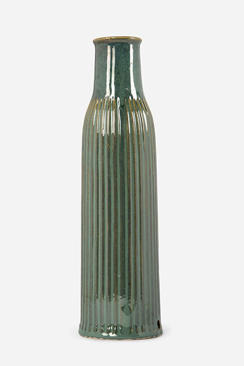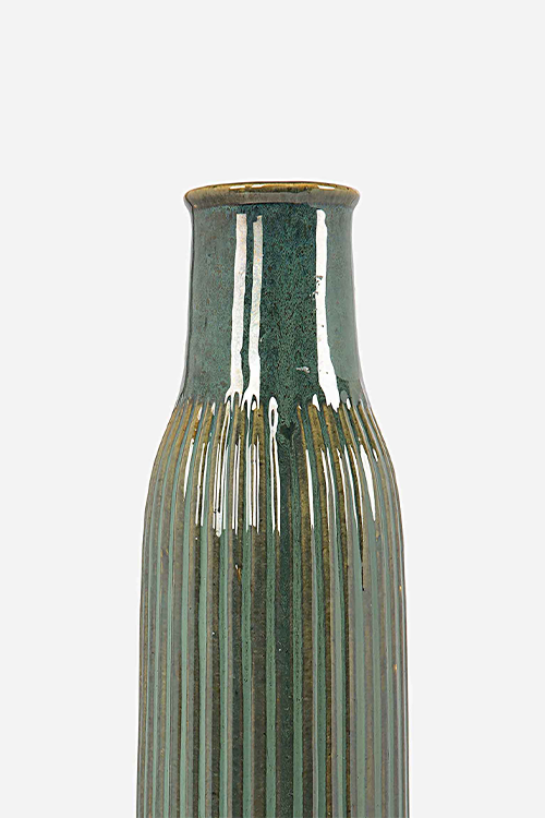 A glazed ceramic vase for a stylish corner. This greenish-blue glazed ceramic vase is elegant and will be quite the showstopper in any corner of the home. Place a few orchids or other long-stemmed flowers inside to further enhance the appearance of the room. This ceramic product is handcrafted in Uttar Pradesh, and is a part of Ikai Asai’s Studio Pottery collection of clayware, made by potters in studios across India. This product is handcrafted and slight variations in colours, textures and forms make each product unique in its own way. Pottery in the Indian subcontinent has a long history — it has existed as a craft form for centuries. Ikai Asai’s collection of stoneware is developed in collaboration with small-scale units and largely processed by hand — bringing together the best of industrial technology and craft. Stoneware is made from clay and fired at high temperatures in a kiln to harden. Characteristically, stoneware is less porous and more durable than earthenware. Stoneware is made by kneading the clay and then throwing it onto a pottery wheel. The shaped clay product then goes through the process of bisque firing, glaze application, drying, and glaze firing to make the final product.