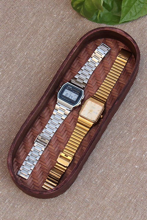 DIMENSIONS - 24.5 cm x 9 cm x 3.5 cm MATERIAL- Bamboo woven & Bamboo Ply dyed in Azo free dyes.