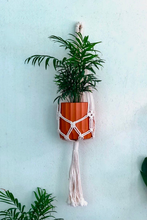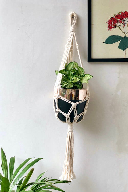 Delicate yet durable, our handcrafted macramé plant hanger is a perfect mate for all your plants. The product fits different sizes of pots and mingles effortlessly with your garden space. With our intricately knotted plant hangers, let your greens dangle!