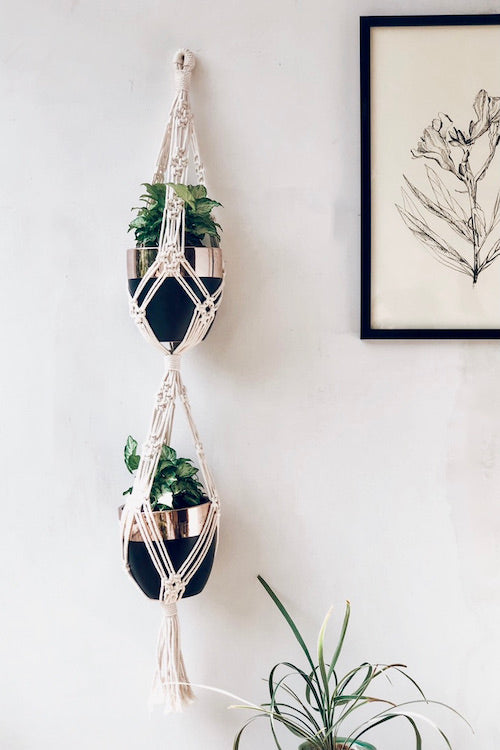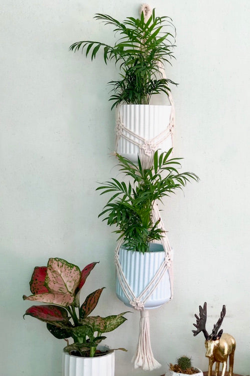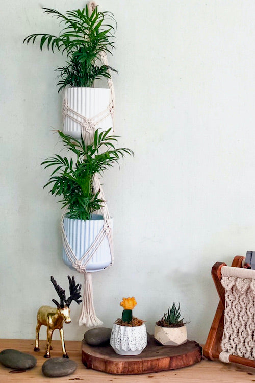 Delicate yet durable, our handcrafted macramé plant hanger is a perfect mate for all your plants. The product fits different sizes of pots and mingles effortlessly with your garden space. With our intricately knotted plant hangers, let your greens dangle!