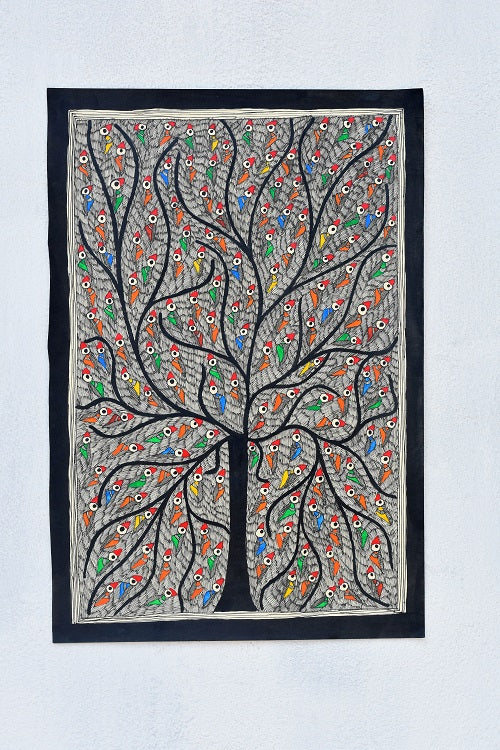 Family of peacock resting on tree design Handpainted Madhubani painting Wall Hanging, size 22.3 inches*15 inches