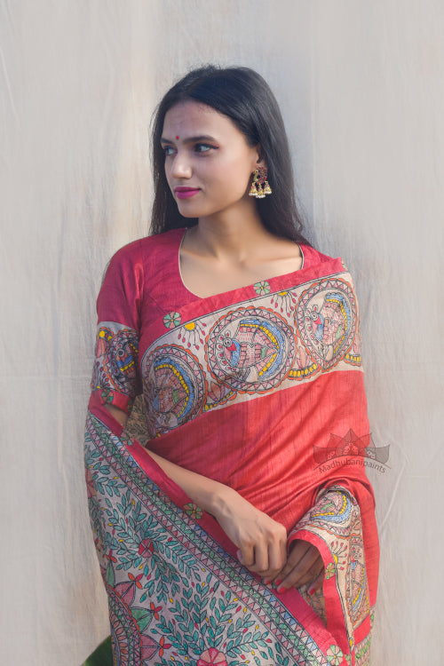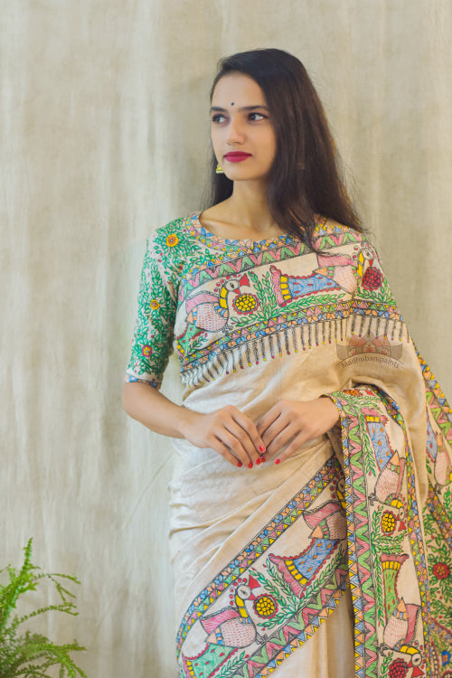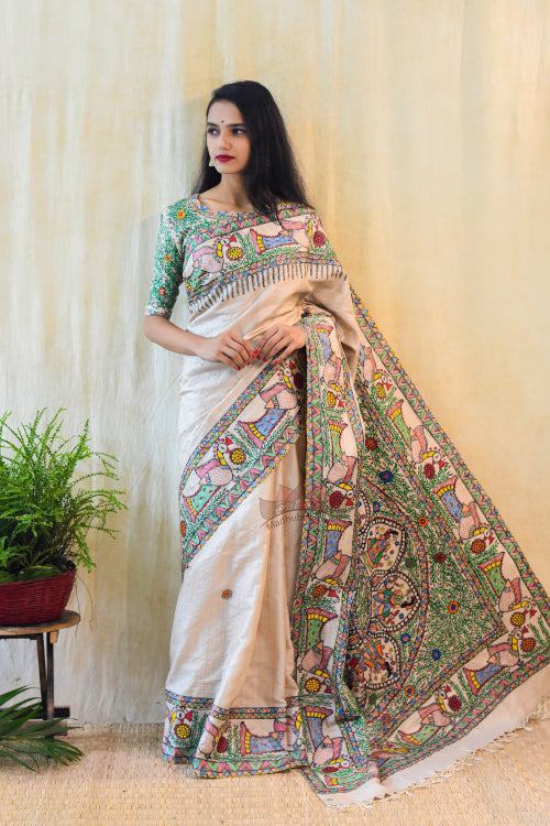 MANORATH Handpainted Madhubani Tussar Silk Saree Madhubani Paints