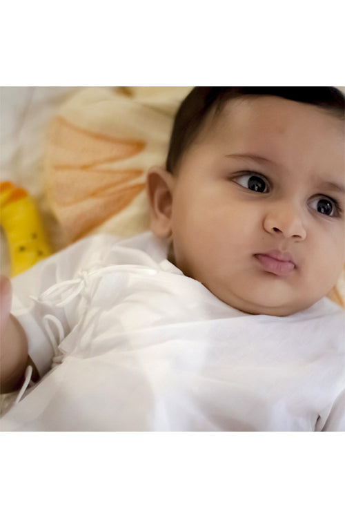 Designed and Made in India, this limited edition eczema-friendly, all white undyed organic cotton baby gift set is ideal for babies with sensitive skin. Designed to be uniquely gender-inclusive. This gender-neutral gift set contains: 1 x angarakha top: 100% organic cotton. Tie-up closures and flat seams for ease of wearing and fit. Stitching detail on the neckline adds stability and aesthetic value.