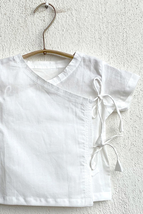 Celebrate the arrival of the little one with our limited edition, gender-neutral, 100% organic cotton clothing for newborn babies. Designed and Made in India. Set contains: 2 x angarakha top: 100% organic cotton. Pristine white top, part of our essential range is complemented with a printed animals top inspired by the 'Zoo Treat' poem and created by traditional Ajrakh artisans in naturally hypoallergenic indigo colour. Tie-up closures and flat seams for ease of wearing and fit. Stitching detail on the neckline adds stability and aesthetic value. Conscious of minimising waste, it comes packed in a reusable muslin bag with an interactive paper game tag, ready for gifting.