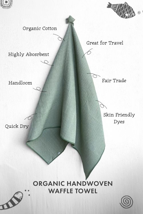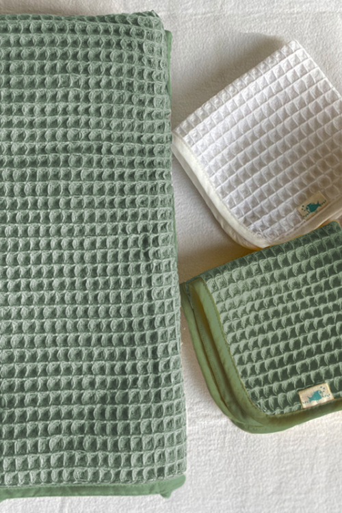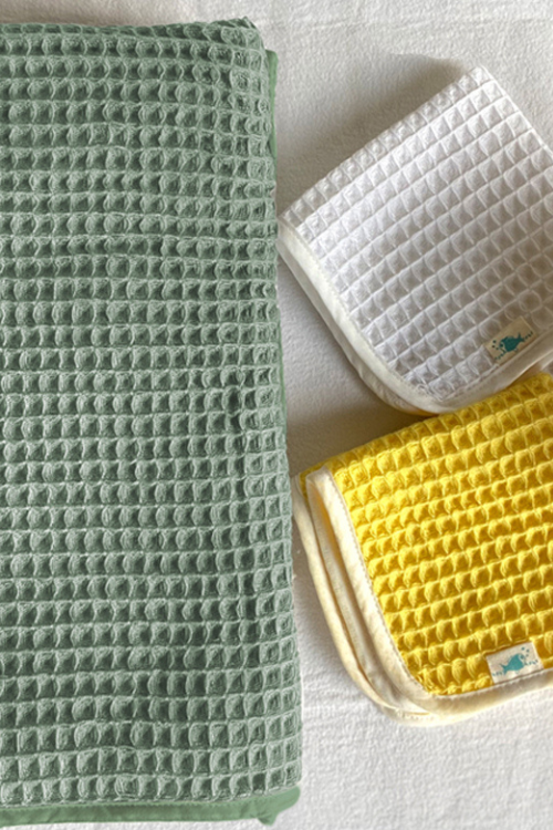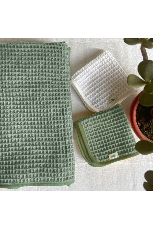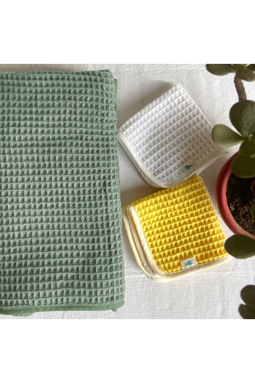 Our limited-edition towel sets are 100% organic cotton. The handwoven waffle weave makes them more absorbent, softer and quicker to dry as compared to regular plush towels. Our towels are dyed in azo-free colours which are gentle on the skin and environment. A gender-neutral gift, they come packed in a reusable muslin bag with an interactive game tag, ready for gifting. Set contains: 1 x Rectangular Towel 2 x washcloths in assorted colours. The handwoven waffle weave makes our towels more absorbent, softer and quicker to dry as compared to regular towels. They are dyed in GOTS certified azo-free colours, which are gentle on the skin and the environment. A gender-neutral gift, they come packed in a reusable muslin bag with an interactive game tag, ready for gifting.