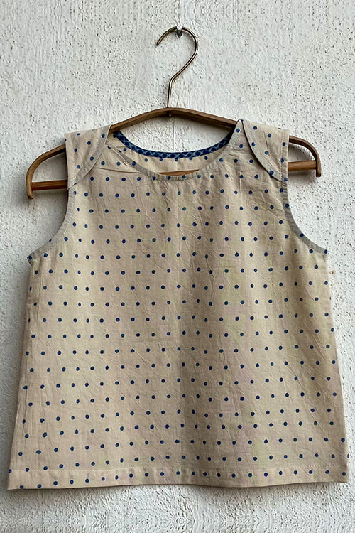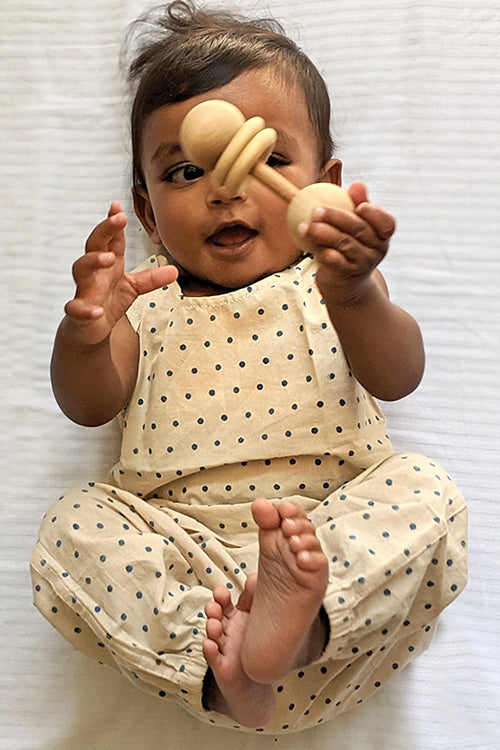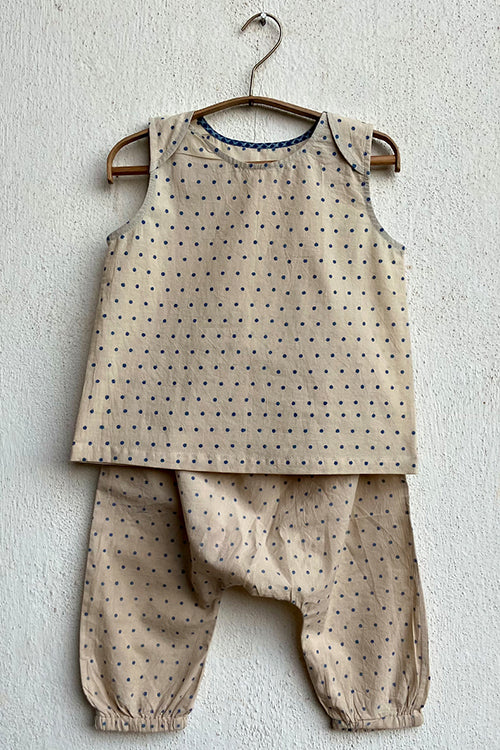 Add comfort to your little munchkin's wardrobe with our summer special Organic Cotton clothing. Simple styles for everyday play. Set contains: 1 x jhabla top: 100% organic cotton sleeveless top with envelope neck for hassle-free wearing. Hand block printed polka top created by traditional Ajrakh artisans in naturally hypoallergenic indigo colour. 1 x pants: 100% organic cotton. Matching handblock printed polka pants with elasticated waistband and bottom hem. Part of our Zoo Treat poem collection. Conscious of minimising waste, the set is packed in a reusable muslin bag with an interactive paper game tag, ready for gifting.