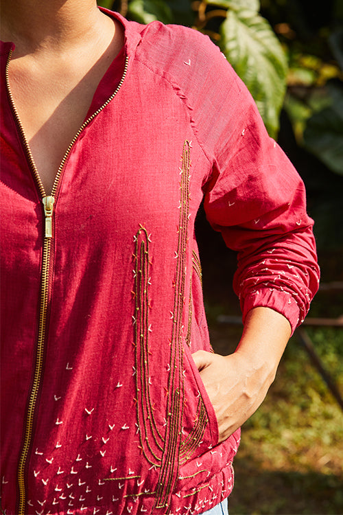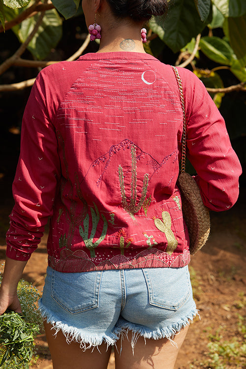 We love designing products by giving the Indian craft a contemporary twist! ‘Cherry Me’ in tomato red is a jacket that is made to flaunt! Crafted with care in pure cotton fabric, this bomber jacket is heavily decked with hand embroidery depicting a scene from the desert. The cactus, hills and creepers are all made in a combination of satin, stem, chain and running stitch. The sleeves are also completely speckled with embroidery. It has a sturdy functional zipper, elastic on the waist and the cuffs, and two pockets. This jacket doesn’t belong in the cupboard, so take it out for a spin in the sun!