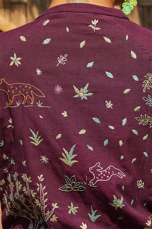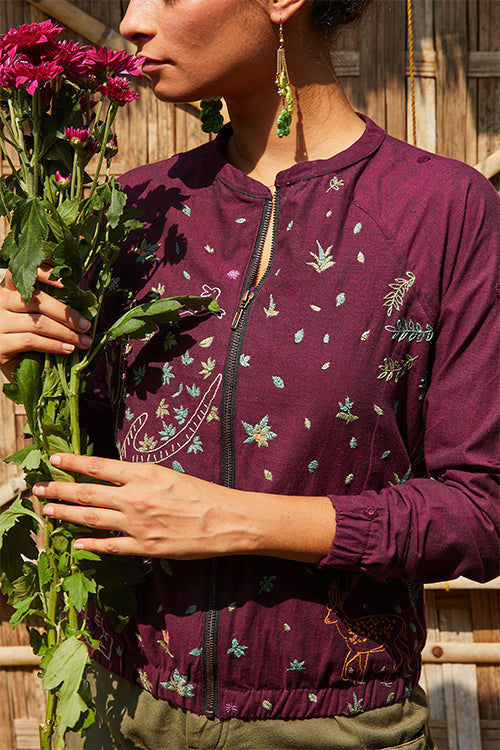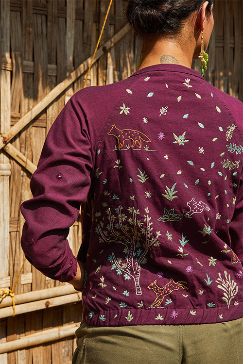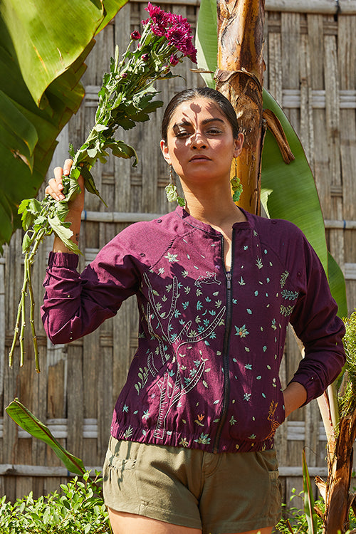 This exquisite work of art is called ‘Night Forest’. Made from pure cotton fabric, this remarkable design is heavily decked with hand embroidery. The scene from a forest with animals and trees is made from a combination of satin, stem and running stitch. The tiny mirrors provide the much-needed twinkle. It has a sturdy functional zipper, elastic on the waist and the cuffs, and two pockets. Layer this jacket over another Okhai original and accessorize with statement pieces. Don’t forget to tag us on Instagram!
