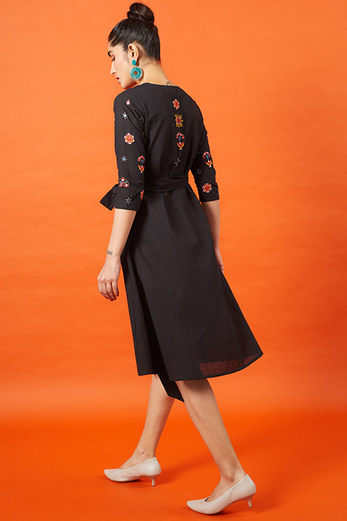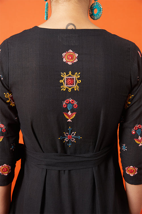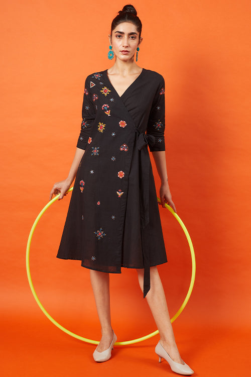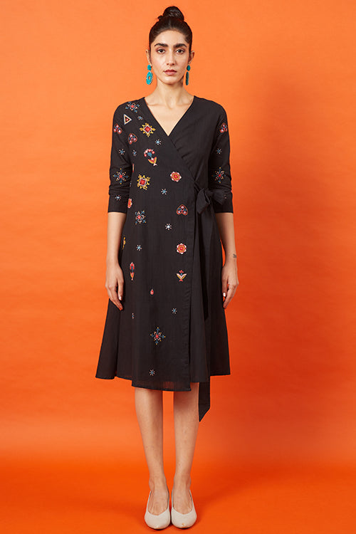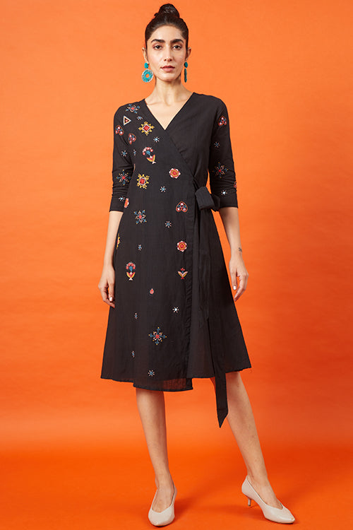 This stunning 'Empress' is made in a wrap dress silhouette to give you fit to flare contour according to your liking and comfort with the help of the tie around. Threads and mirrors of reds and yellows are scattered all over the dress with Kutch embroidery to make you feel adorned and decorated with traditional craft. That's not all, a line of four beautiful motifs has been carefully embroidered at the back to add a pinch of jazz and complete the whole for you so that you wouldn't have to worry with the styling as much and, just add a statement piece of earrings, and you're ready to go!