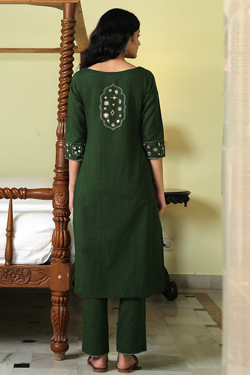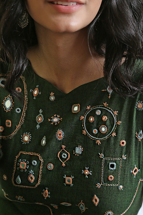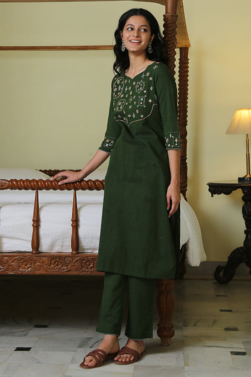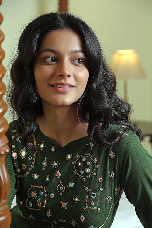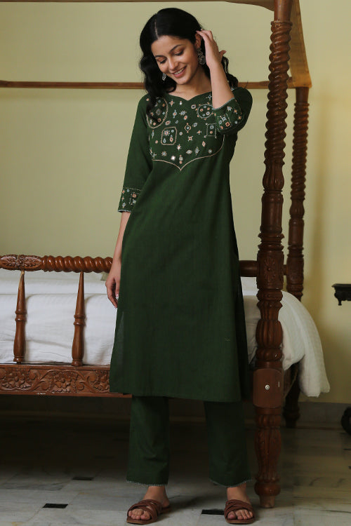 The season of festivites is just round the corner and we are here with our all new Mirror Work Collection to have you sorted for your next Diwali party. The richness of this green pure cotton kurta reflects in its intricate mirror work all over the front & back. The assymetrical neckline gives it an edgy look while multiple embroidery techniques are the highlight.The cherry on the top is extra detailing around the edges of the sleeves & buttonhole stitch at the bottom of the pants. Comfort being our utmost priority, we've added pockets in the pants for your essentials. We've created this beauty for you to look glamorous without having done much.