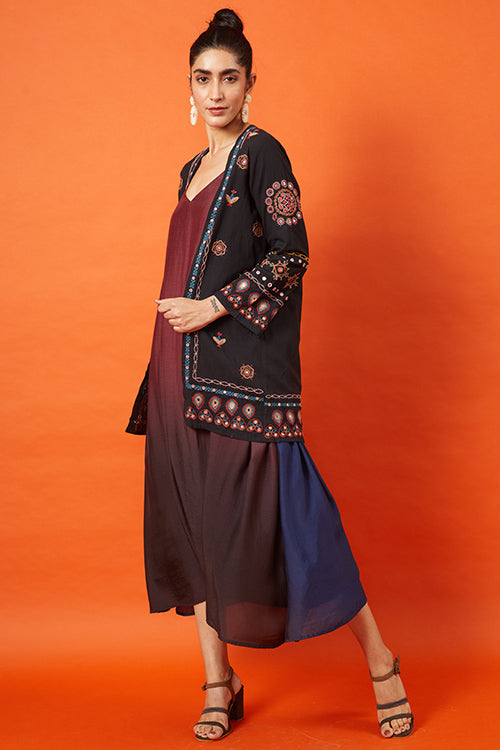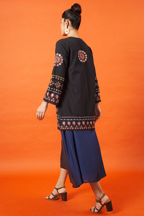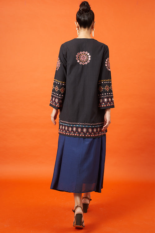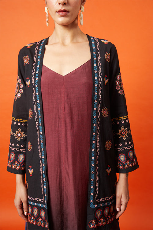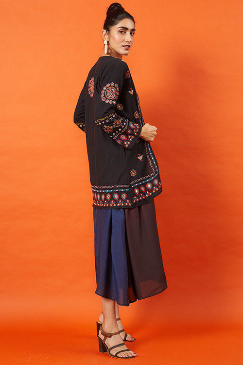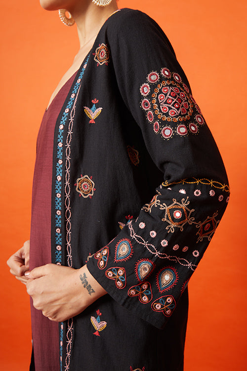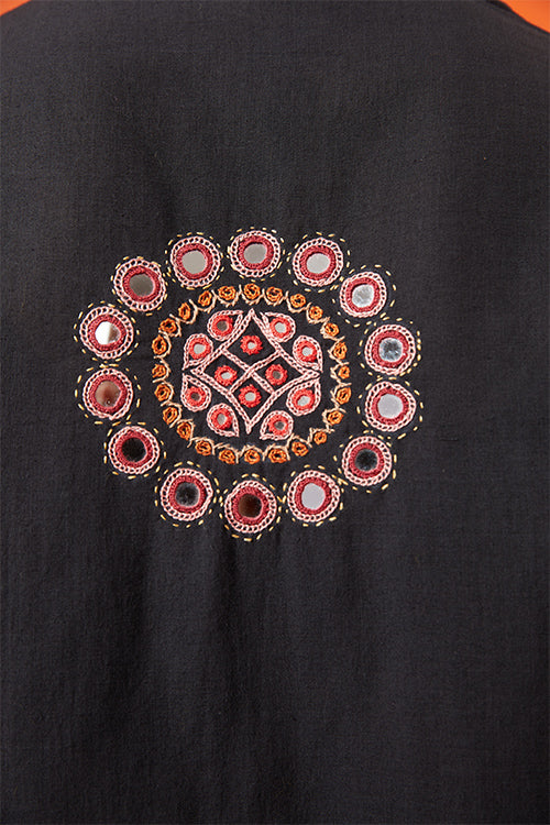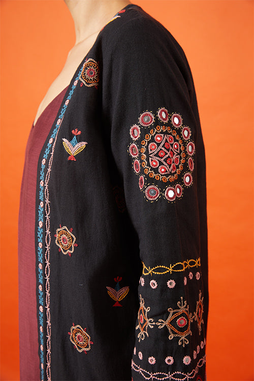 Be the queen of style in this ‘Maharani’ long jacket. With beautiful embroidery and mirrors, this black jacket is sure to turn heads. The double knot, ladder, stem, thorn, chain and running stitch create a one-of-a-kind look that is perfect to elevate your look for any special occasion. The circular motif at the back centre is the perfect finishing touch. A buttery soft mulmul lining is added underneath the jacket for you to feel warm and comfortable as ‘Maharani’ touches your skin. What’s more, is that it has two roomy pockets for your essentials. It would a perfect piece if you want to add a little jazz to your boring outfit.
