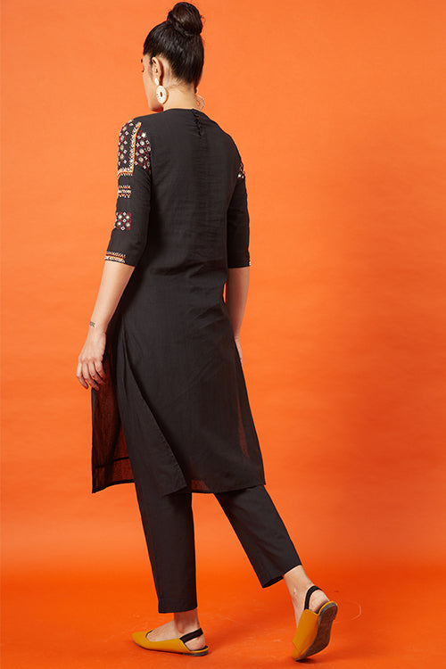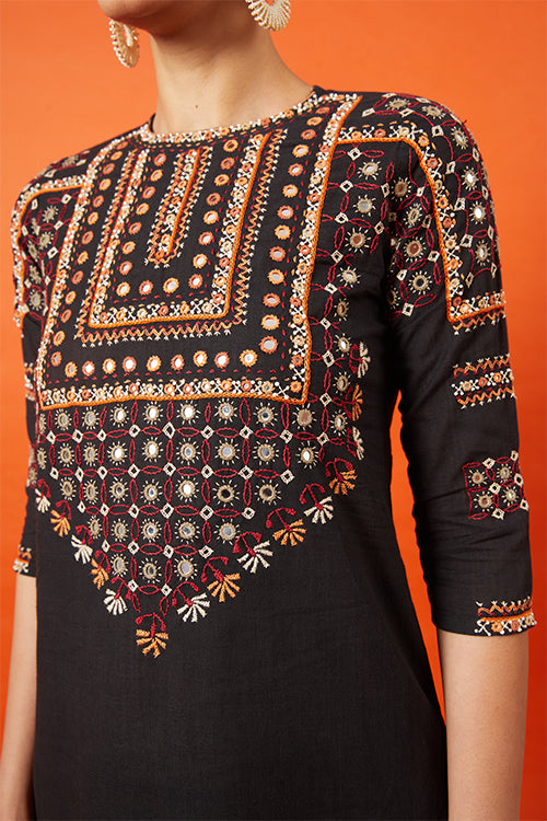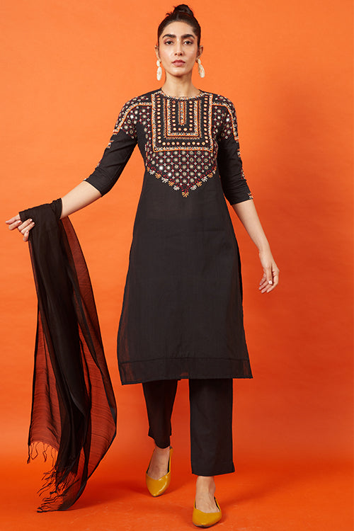 "They say that it's only in the darkness that you can see the stars, we are here to prove it wrong with our 'Midnight' beauty that will showcase the glistening magnificence of wearable art. This stunning Kurta-Pant-Dupatta set will leave you in awe of its intricately kutch embroidered threads, mirrors and beads on the front yoke and the sleeves. That's not all, the kurta comes with a lovely line of embellishments at the bottom as well to get you festive ready! The pants with this ensemble promise to provide the perfect fit by providing a loop inside zipper with press buttons along with darts in front and elasticated at the back to give you the utmost comfort whilst leading the fashion game. You can layer it up with the lightweight yet soft chanderi dupatta given with this set to complete the look. Mix and match with the kurta, pants and dupatta with other pieces of garment in your wardrobe to style up or style down according to the occasion. Note - The garment may shrink after washing due to its fabric. We recommend you dry clean this ensemble.