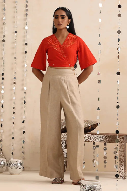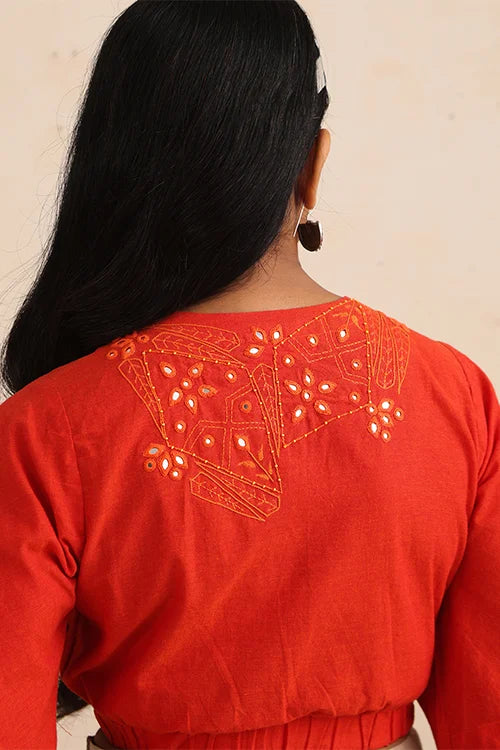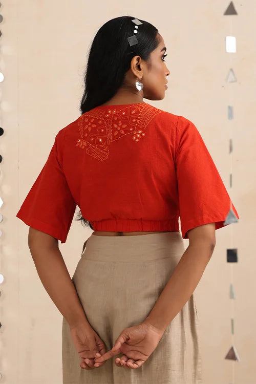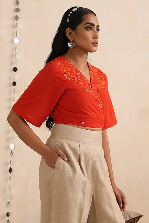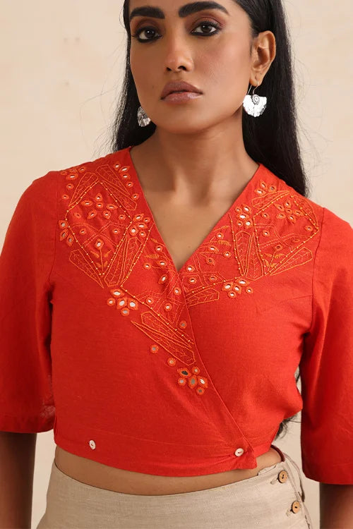 Thoughtfully designed with elastication at the back for a flattering fit, this top features a smart wrap silhouette secured with a loop and MOP button at the bust, along with additional inner waist buttons for a neat closure. The front panels and back are intricately adorned with satin and stem running stitches, enriched by dazzling round, diagonal, and almond-shaped mirrors, highlighted further with delicate orange beads. Each detail echoes the grandeur of Jaipur’s iconic Amer fort, reimagined into a contemporary festive garment. Celebrate the season in this vibrant wrap top, ideal for festive occasions, cultural gatherings, and cozy celebrations. Pair it with pants, skirts, or layer it over a saree for a versatile festive look.