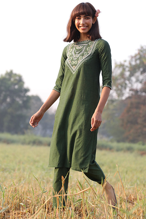Embroidered mirror work and trailing hand-embroidery on the yoke of the kurta is a statement. This antique green colour of the set will bring out the hand embroidery to perfection, with an exquisite embroidered motif at the back and an intricate embroidery on the sleeves by our labour of love. For added comfort, the kurta also comes with shoulder loops with press buttons. The pants that come along with the set features an elastic at the back making it super easy to wear. And with two slits in the kurta and two pockets in the pants, it's just what you seek to add some spice to your wardrobe. Great for festivals and all days of style, 'Fresh Green' is going to be your go-to kurta pant for all the traditional events!