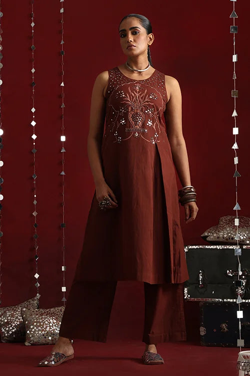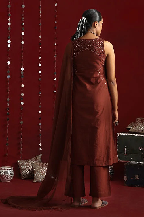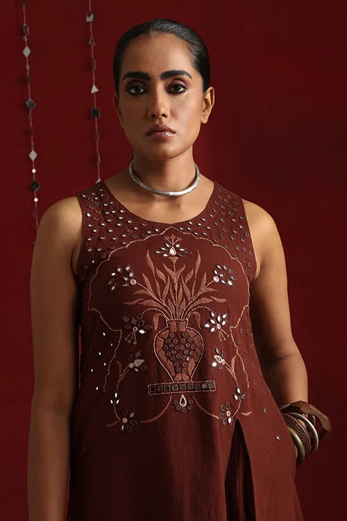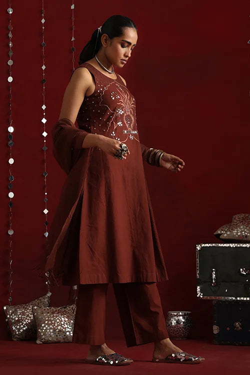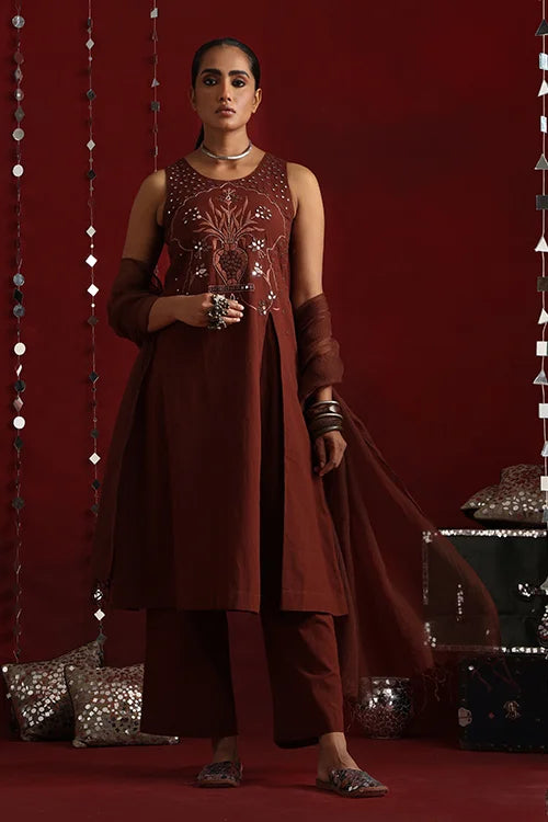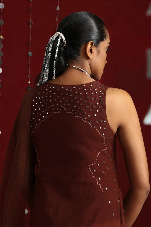 Inspired by the opulence of Jaipur’s mirror clad forts and mahals, this statement ensemble features a sleeveless kurta crafted in a rich coffee hue, adorned with intricate mirror work using satin and stem stitches. The front yoke is adorned with elaborate embroidery that flows till the waist. The garment showcases a dazzling play of round, square, diagonal, and almond-shaped mirrors, accented with golden metal sea beads. The back yoke carries the glimmer forward with scattered mirrors, bordered by delicate running stitches. Thoughtful touches like two functional pockets add practicality to elegance. The accompanying pants feature a broader hemline and elasticated back waist for a perfect fit. Completing the ensemble is a graceful Kota doria dupatta, adding a soft, traditional touch to the fit.