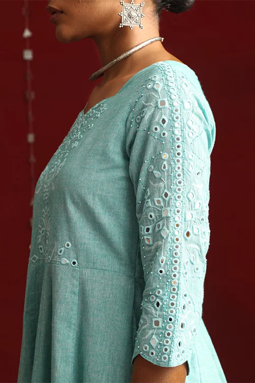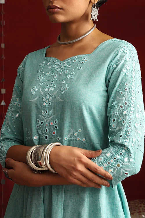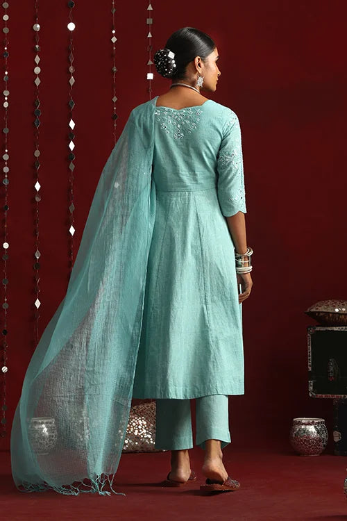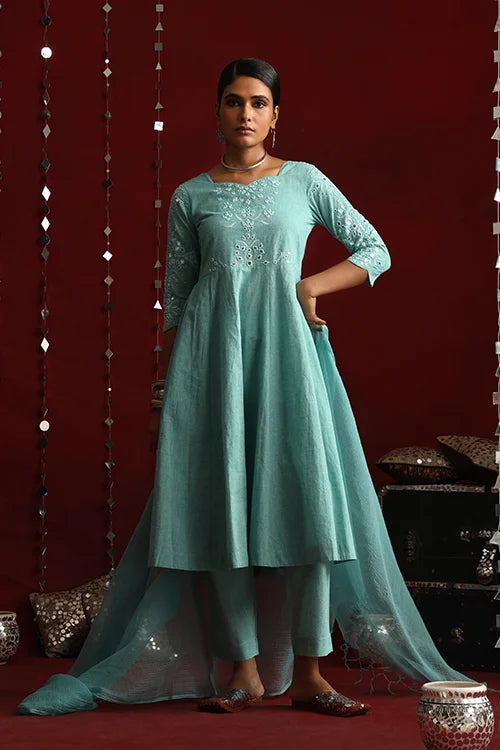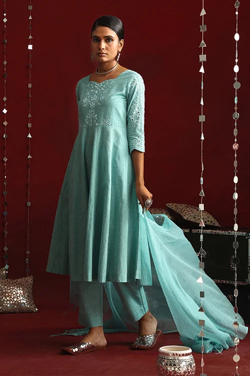 Celebrate festivities with this sea green kurta pant set with dupatta, inspired by the mirrorwork of Jaipur’s Sheesh Mahal. This piece features intricate hand embroidery crafted with satin and stem stitches. Mirrors are carefully embedded and outlined with running stitches, further highlighted with delicate white beads. This exquisite detailing decorates the sleeves, as well as the front and back yoke, creating a dazzling play of light with every movement. Designed with two side pockets, the flared kurta beautifully balances functionality and festive elegance. The coordinating pants ensure comfort with partial elastication at the back for a tailored yet flexible fit. Completing the set is a lightweight soft Kota Doria dupatta in the same soothing green shade, adding a graceful layer of tradition.