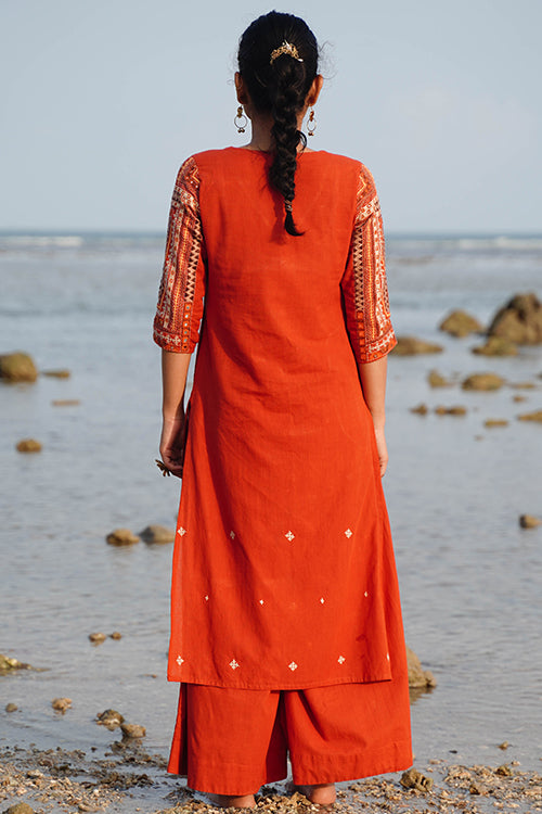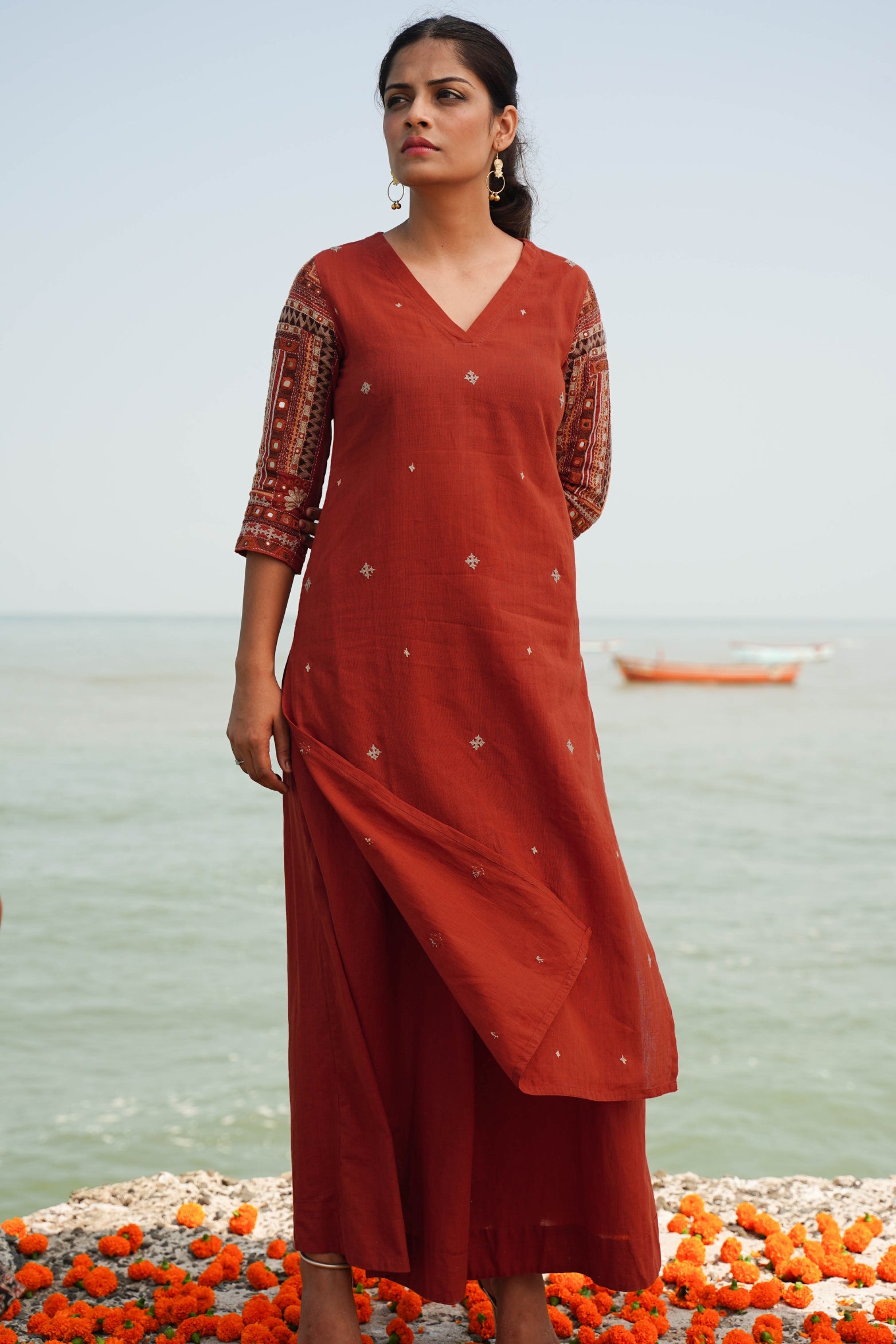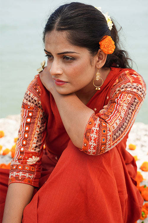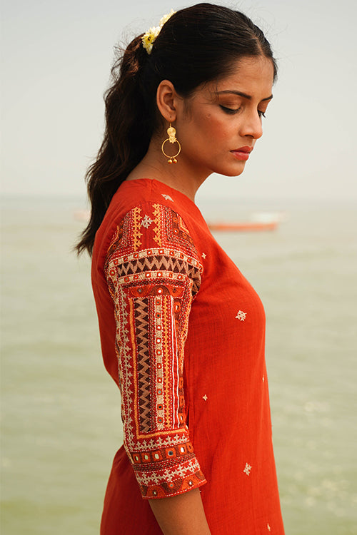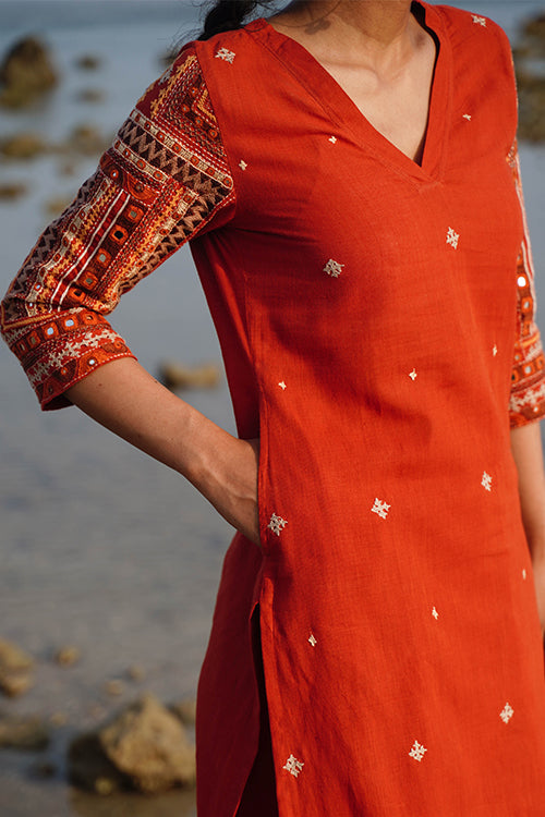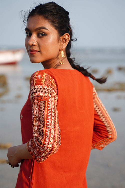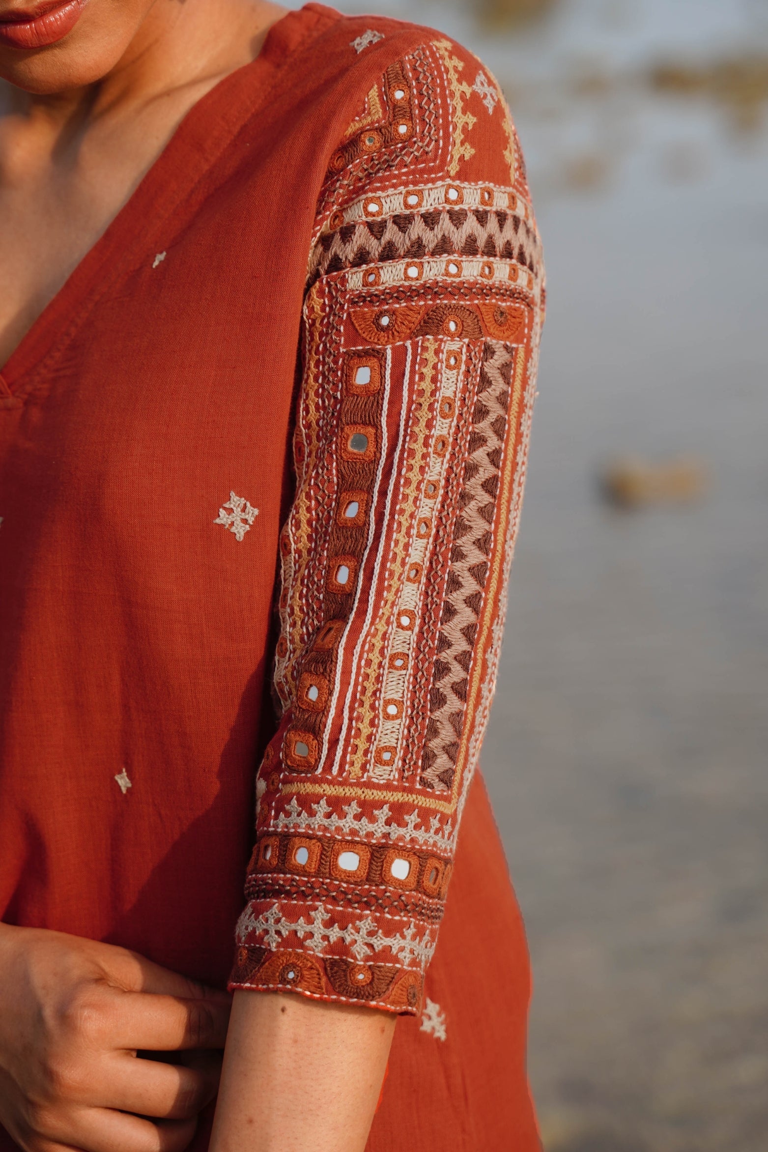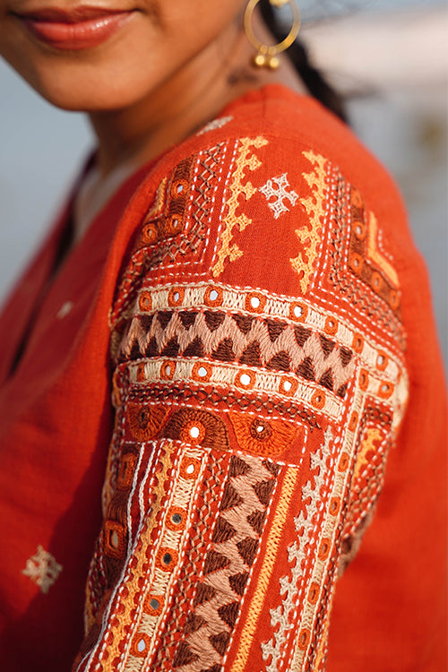 Radiating the rustic charm of a warm sunset, the "Naarang" kurta brings an earthy elegance to your wardrobe. Handcrafted from pure cotton in a rich rust orange, it features exquisite Kutchi embroidery and Bavariyo stitch detailing that speak to the essence of tradition. The V-neckline and double-layered sleeves, adorned with mirror work, add a subtle flair, while two discreet pockets blend practicality with style. A piece that effortlessly balances craft and comfort, this kurta is ideal for any occasion that calls for understated beauty. Thoughtfully designed, the "Naarang" carries the warmth of its color and the artistry of its craftsmanship in every stitch.