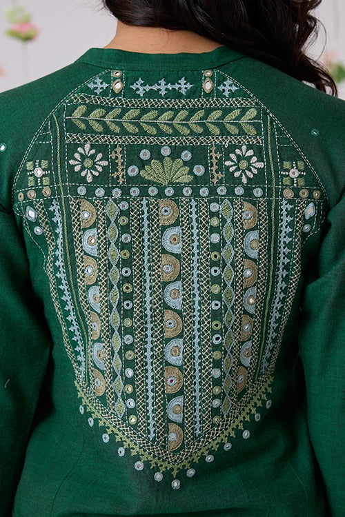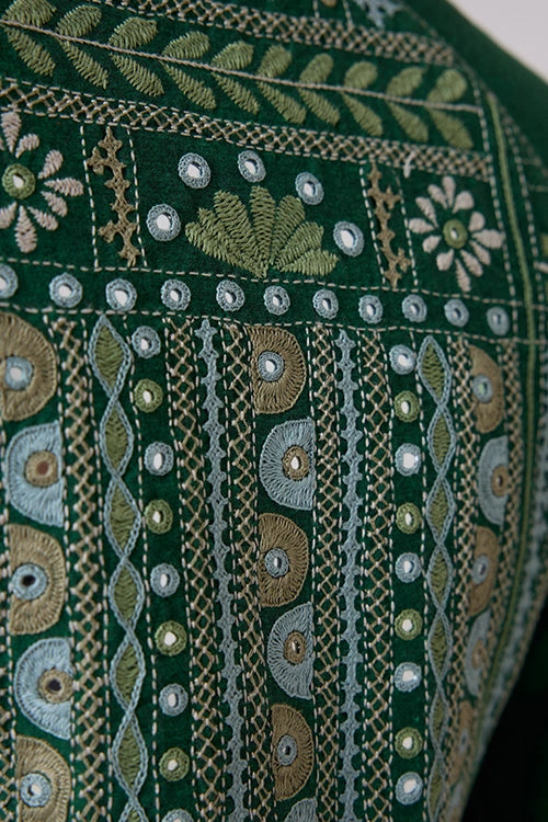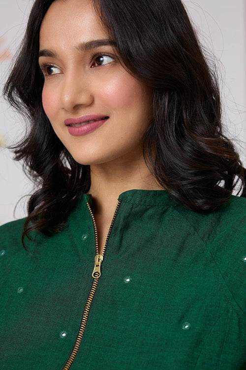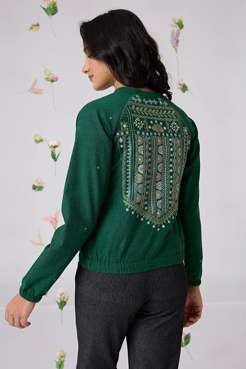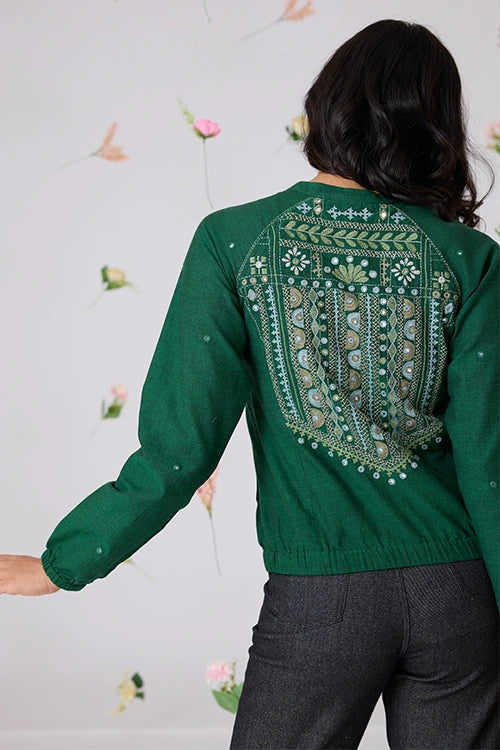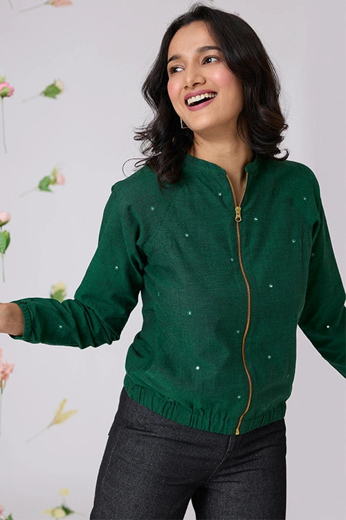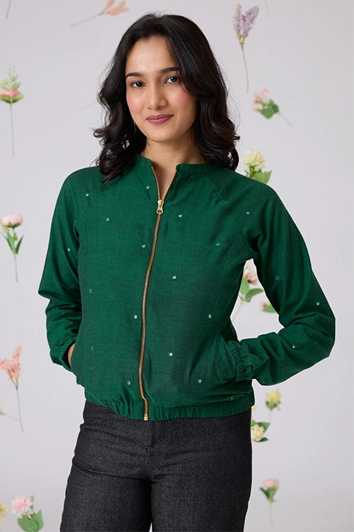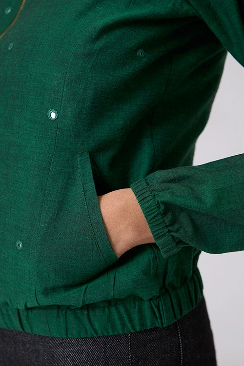 Traditional craft meets contemporary silhouette in the "Pastoral" Bomber Jacket! Crafted from pure cotton fabric, this emerald green Bomber Jacket comes with a zipper and 2 handy pockets in the front. For warmth, there is double-layered fabric in the front and back yoke. Ensuring a snug and comfortable fit, there is elastication at the waist and sleeves edge. The back yoke of the jacket steals the show with its ornate embroidery work and mirror embellishments. Mirrors are scattered all over the front and on the sleeves as well. For all those festive occasions when you want to go western, "Pastoral" has got you covered. Time to get yourself this majestic Bomber Jacket and receive all the compliments!