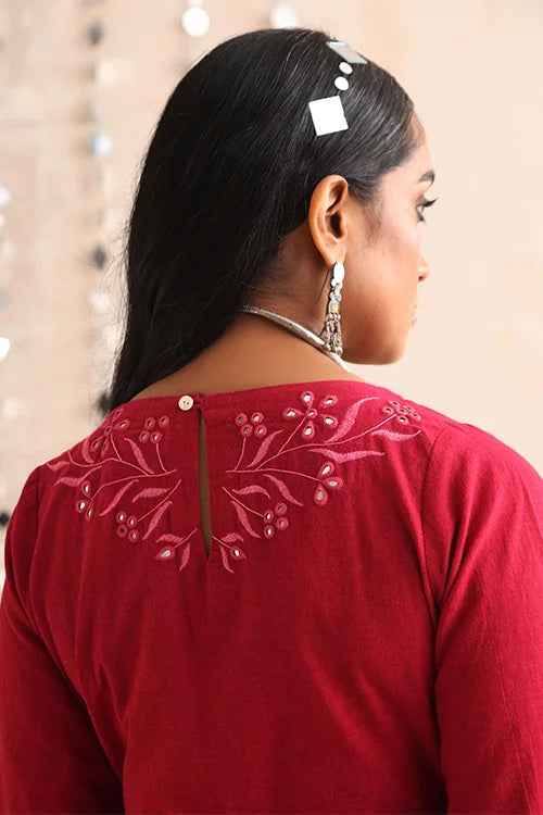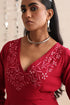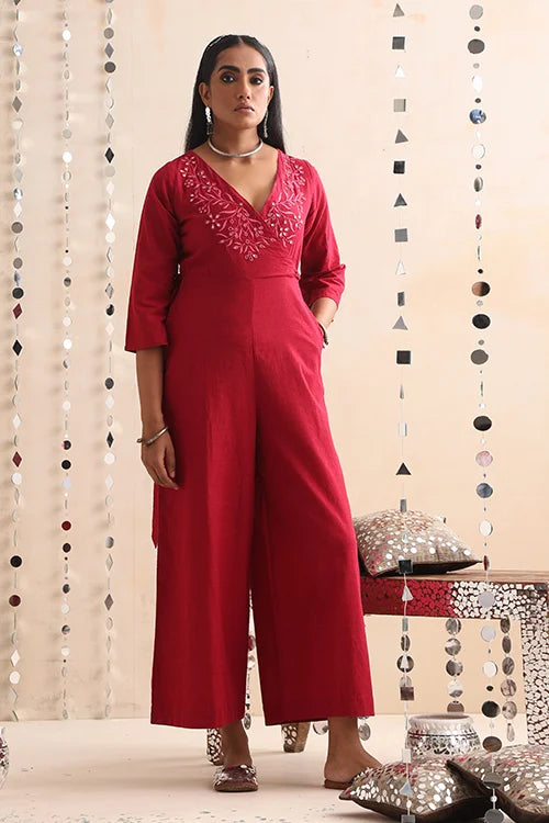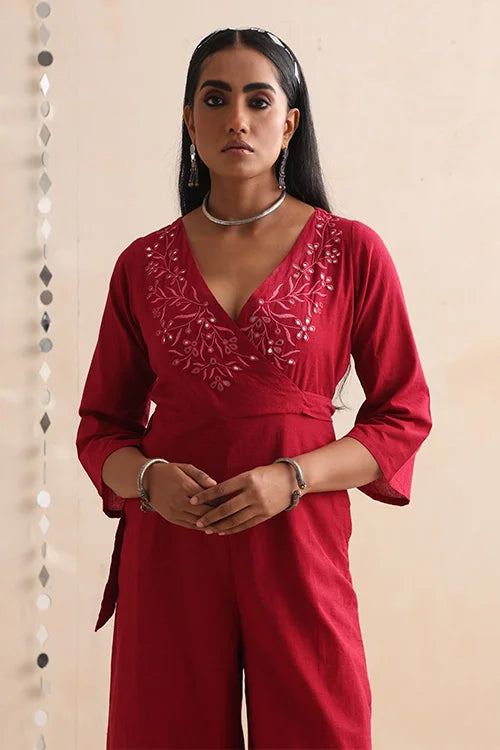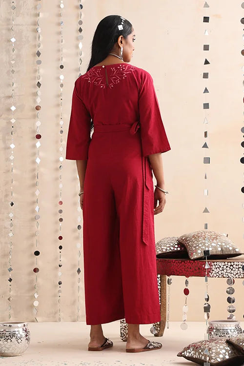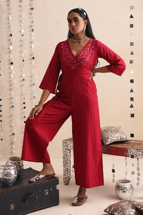 A festive pink jumpsuit from our Sheesh collection, inspired by the dazzling mirror-studded Mahals of Jaipur, this functional wrap silhouette comes with a detachable belt to accentuate your waistline, while a concealed side zipper ensures a seamless fit. The front and back yoke are adorned with intricate embroidery in satin and stem stitches, highlighted with round and almond-shaped mirrors with motifs inspired by Sheesh Mahal. Perfect for festive gatherings, family celebrations, cultural events, and intimate weddings, this jumpsuit offers a unique balance of tradition and modernity. Pair it with statement earrings and juttis for a regal yet effortless festive look.