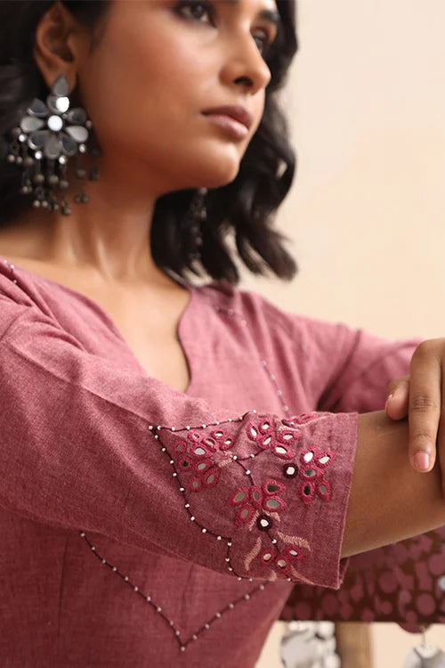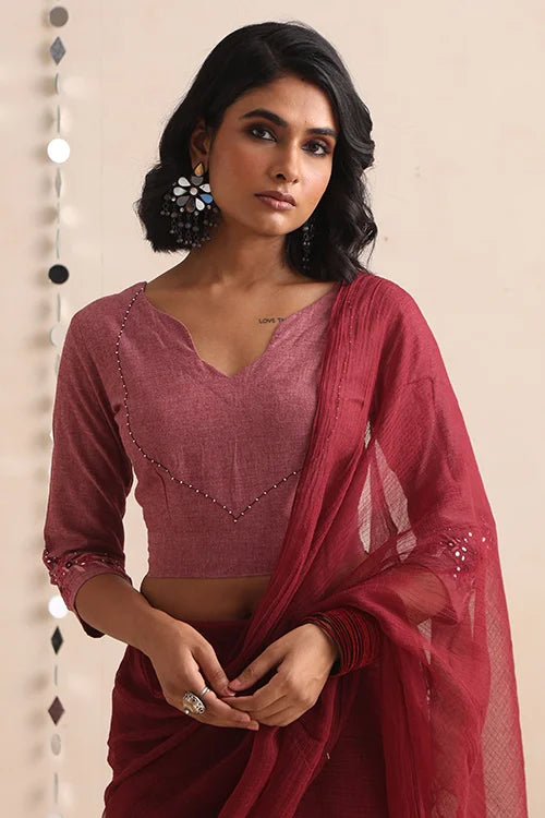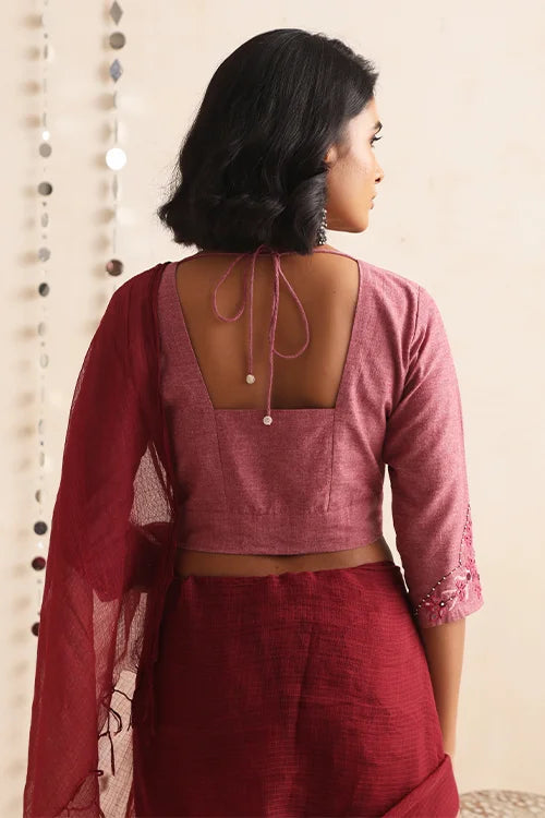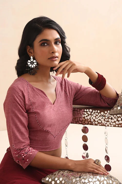 Elevate your festive style with Okhai’s 'Prism' hand embroidered blouse. Designed with a concealed side zipper for a sleek finish, this blouse features double-layered fabric at the back and waistline for added comfort and structure. The back tie-up detail with drawstrings, finished with Mother of Pearl (MOP) buttons, lends a playful yet elegant touch. The highlight is it's hand embroidery - satin and stem stitches embellished with almond and round mirrors, accented with delicate white beads on the sleeve edges. A graceful curved line of embroidery on the front yoke completes the design, capturing the essence of Jaipur’s famous 'Sheesh Mahal'. Ideal for festive season, weddings, cultural functions, and evening gatherings, this blouse can be styled with sarees, lehengas, or skirts for a perfect festive look.