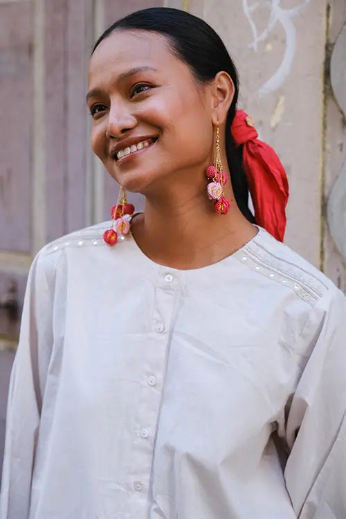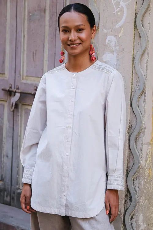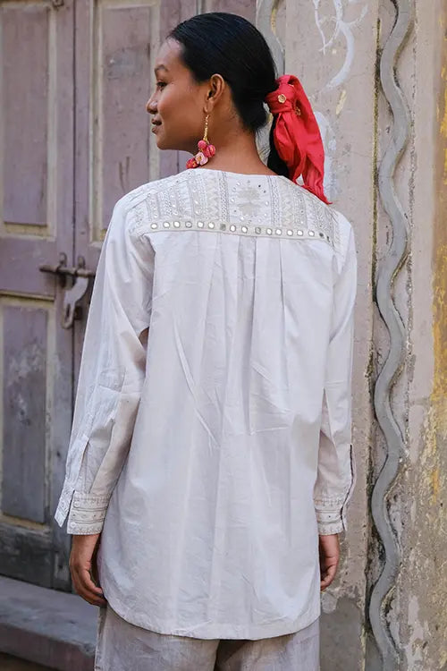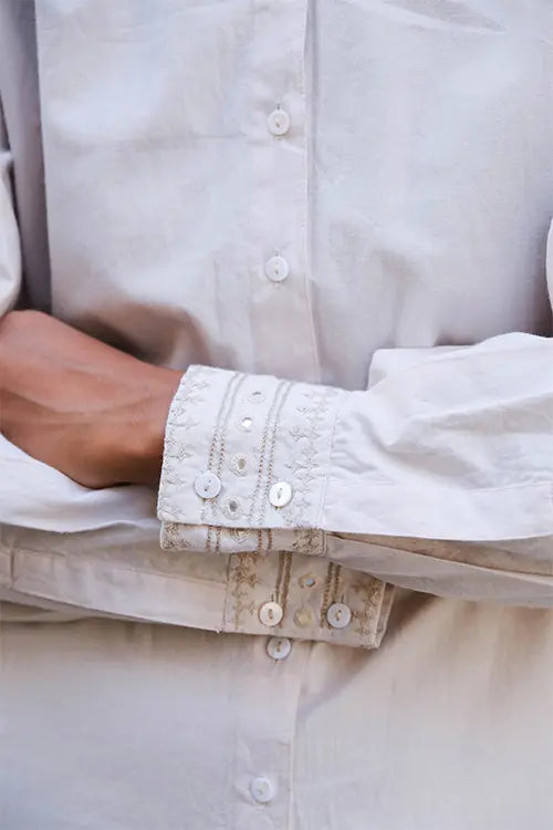 Crafted to celebrate the beauty of every stitch. ‘Sutra’ is an off-white cotton shirt with a functional placket and MOP buttons—two on each cuff for a crisp finish. Hand embroidery in running, chain, stem, satin, and bavadiyo stitches flows across the shoulders, cuffs, and back yoke, dotted with round and square mirrors. A box pleat at the back adds ease. Style it with tailored trousers, jeans, or a long skirt. Perfect for office hours, intimate gatherings, or weekend plans. Understated and elegant—with just the right amount of shine.