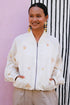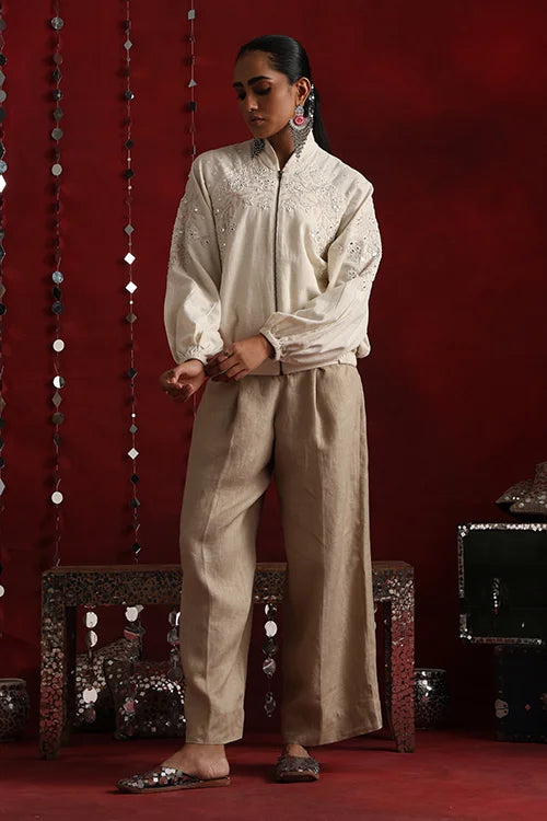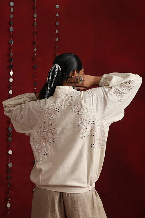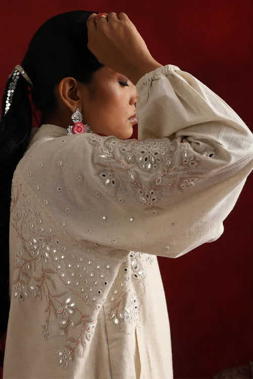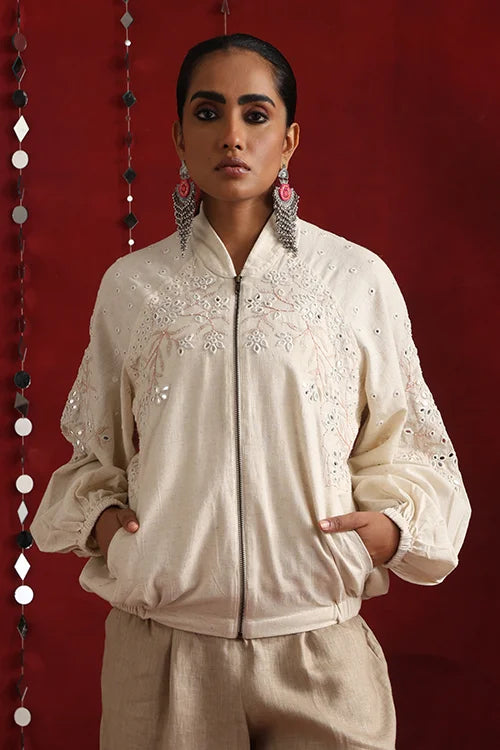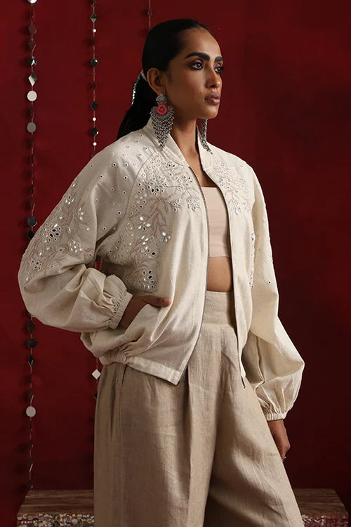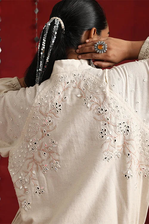 Crafted in double-layered fabric for structure and comfort, this jacket is designed using thousand mirrors. It features two bone pockets at the front and elasticated detailing on the sleeve edges and waistline for a perfect fit. The highlight of the piece is its intricate hand embroidery in satin and stem stitch, embellished with round, diagonal, and almond-shaped mirrors interspersed with delicate white beads. The embroidery gracefully adorns the front, back yoke, and runs along the sleeves, capturing the essence of the magnificent mirror-clad Sheesh Mahal of Jaipur.
