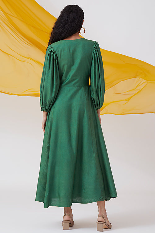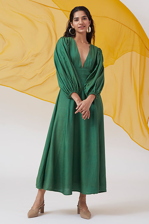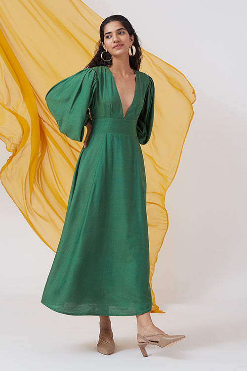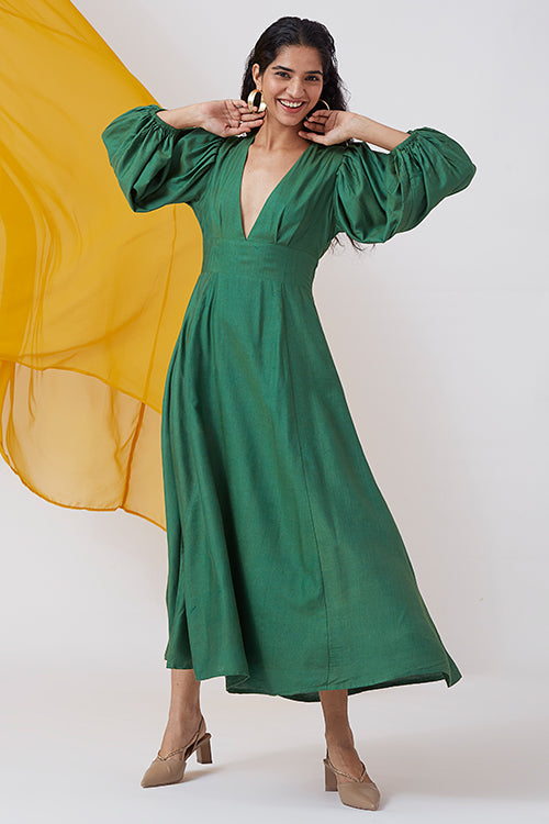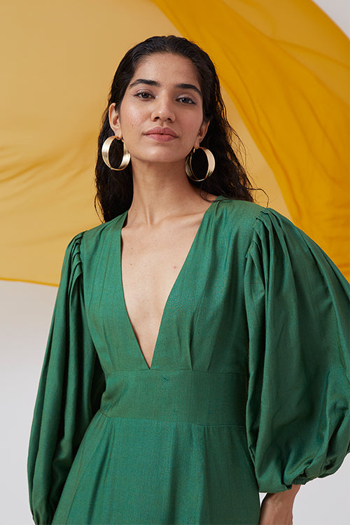 In an emerald green hue, our 'Understated' is an charismatic and relaxed dress perfect for a wide array of occasions. The flattering deep V neckline and elastication at the edge of sleeves gives it an elegant look. The dress also comes with a belt detailing that accentuates your waist and gives you an alluring fit. We have added pockets for your essentials too. Best paired with boots and accessories like a choker and earrings, 'Understated' is waiting to be yours.