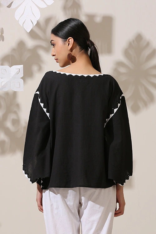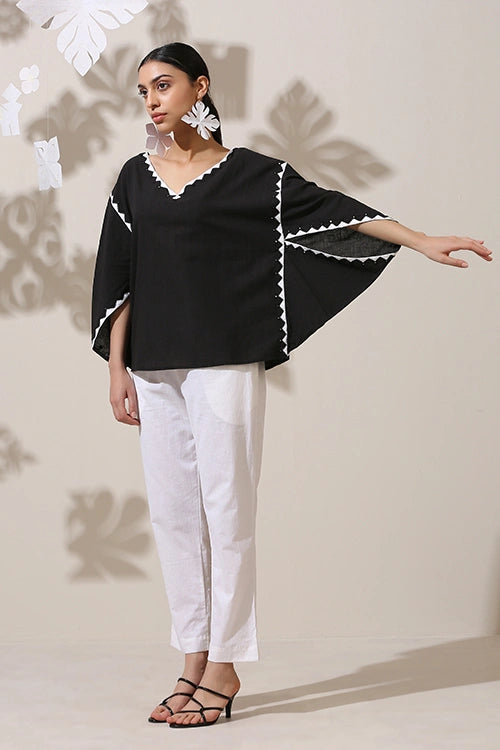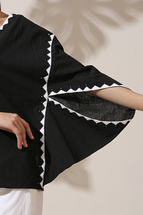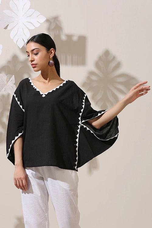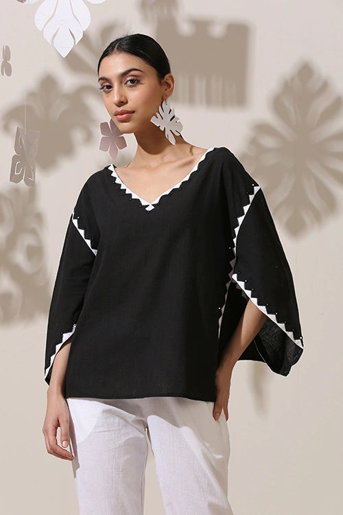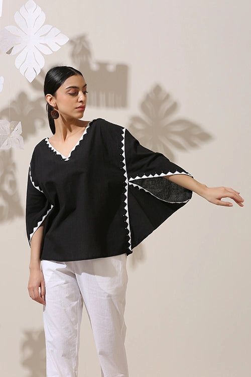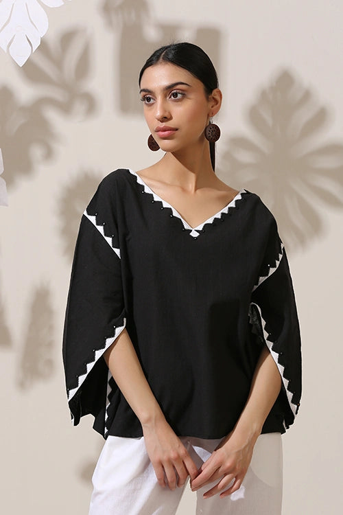 Our 'Whimsical Rhythm' is one of its kind and a modern representation of an age-old craft. A classic black kaftan top, highlighted with white applique triangles around the neckline and sleeves and each triangle tip is accentuated with mirror work. We can already think of innumerable styling ideas, don't forget to tag us on Instagram while you flaunt your Okhai in front of the world!