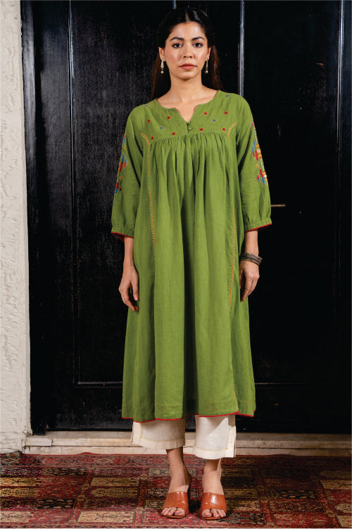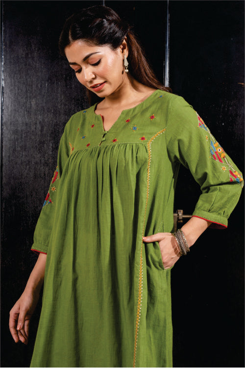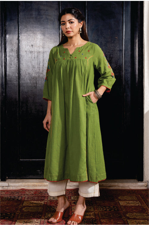 Effortlessly elegant and versatile, this Green Paheli Cotton Kurta is designed for comfort and sophistication. Featuring a front-gather silhouette and exquisite Pakka embroidery on the sleeves, this piece is further enhanced with mirror detailing on the yoke, adding a subtle yet striking touch.Crafted from pure, breathable cotton, this kurta is perfect for summer evenings, office wear, or casual outings. The functional side pockets offer practicality without compromising on style.Pair it with crean pants and sandals for a refined, formal look, or accessorize to stand out in any setting.