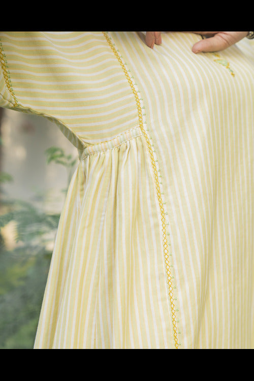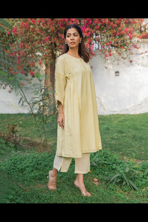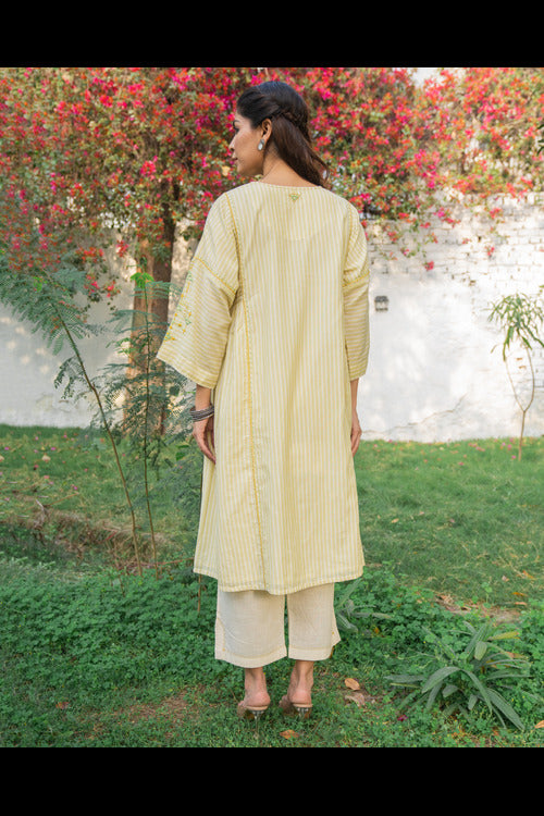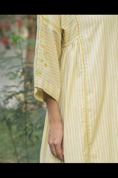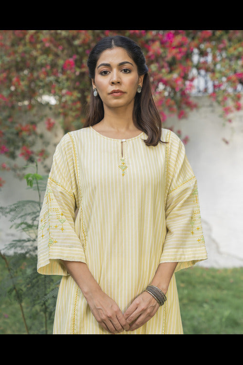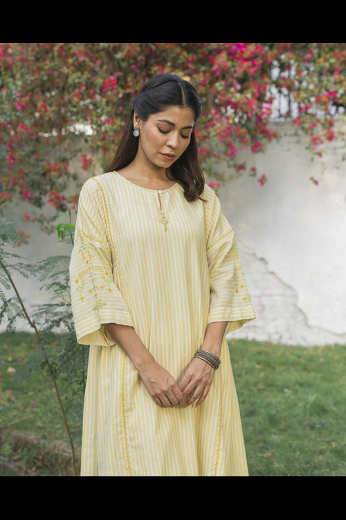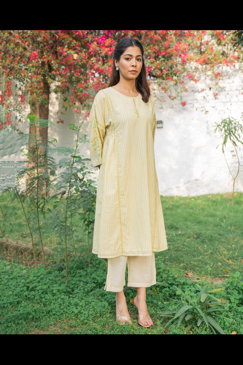 The Suhani Cream Striped Kurta cum Dress is designed for those who appreciate timeless style with a conscious heart. Handcrafted with minimal energy consumption, this exquisite piece supports rural artisans and preserves the age-old tradition of Soof embroidery.Crafted from soft, breathable cotton, this boxy silhouette features side gathers for movement and flow, while the hand-embroidered drop-shoulder sleeves add an intricate, artistic touch. The woven stripes play beautifully across the fabric, enhancing its understated charm. Thoughtfully designed with pockets on both sides and a round neckline with a delicate slit, it offers both style and functionality.Ethically produced with a low carbon footprint, this versatile piece seamlessly transitions from a relaxed dress to an elegant kurta. Whether styled with cream pants and heels for a polished look or paired with a dupatta for added grace, it radiates sophistication and ease.