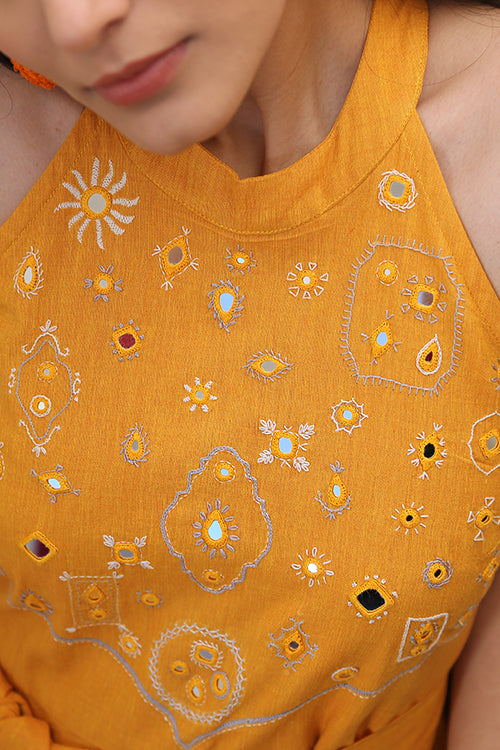 We're here to satisfy your relaxed-festive outfit needs with our 'Star-Lily' yellow dress. Crafted with pure cotton fabric, this design consists of beautiful amalgamation of sophisticated hand embroidery and mirror work. The elegant potli closure detailing at the back adds to the beauty of this attire. An additional belt and pockets have been added for your supreme comfort! Pair these with Okhai's handcrafted jewellery to complete the look.