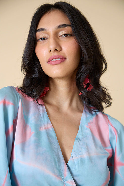 A dress that makes you feel sultry and comfortable in your skin is the best friend everybody needs, and our "Athens" Wrap Dress is just that! In pure silk fabric that flows down the body, it showcases blue and pink prints achieved through the tie-and-dye technique. With a soft mul lining underneath, excluding the sleeves, the dress can be wrapped around. The dress is equipped with shoulder straps with press buttons and a handy pocket. The combination of every element creates a stunning silhouette as "Athens" makes you channel your inner goddess!