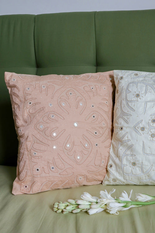 Okhai 'Home' Applique Mirror Work Pure Cotton Cushion Cover (Peach)