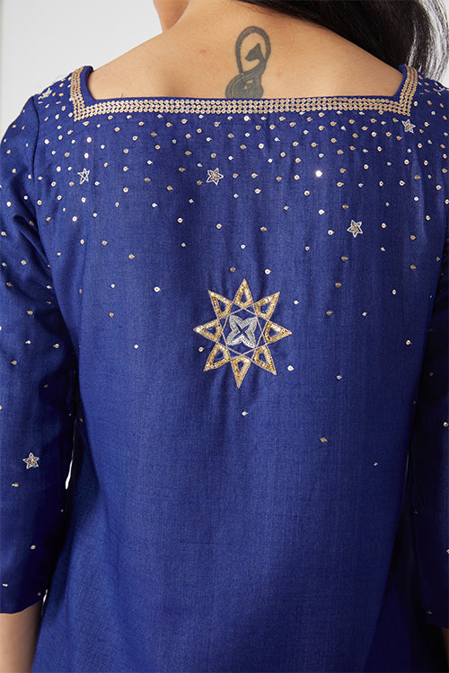 A beautiful amalgamation of a dark slate blue and neon fuchsia is here in the form of this radiating three-piece ensemble to sway you away with its beauty. The inspiration, moon, stars and asteroids, are intricately and heavily embroidered with Kasab, Sabka and Sequins on the front and back of the kurta with different kinds of work on both the sleeves, on a silk blend fabric. The neckline is uniquely cut into a square with a minute U-cut in the middle for you to have enough space to show off your neck. What's more, is that you would not have to carry a bag along with this set because it comes with two spacious pockets for you to enjoy the freedom of socialising empty-handed.