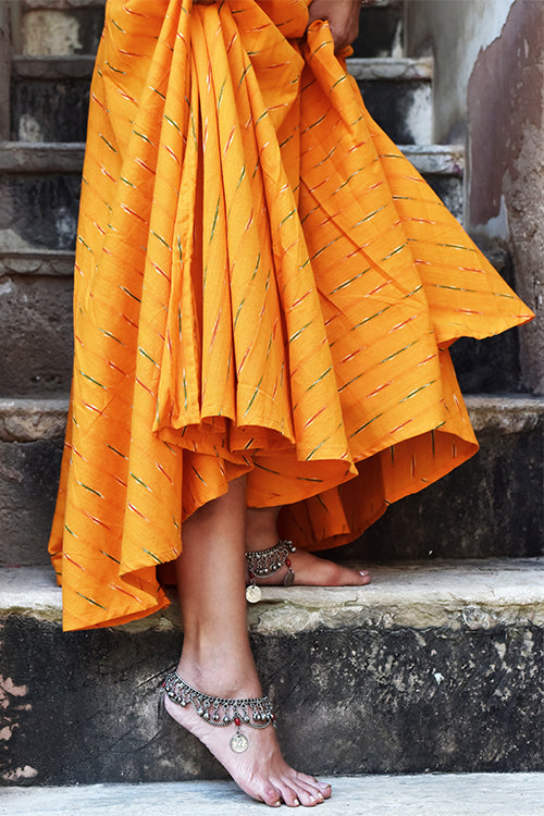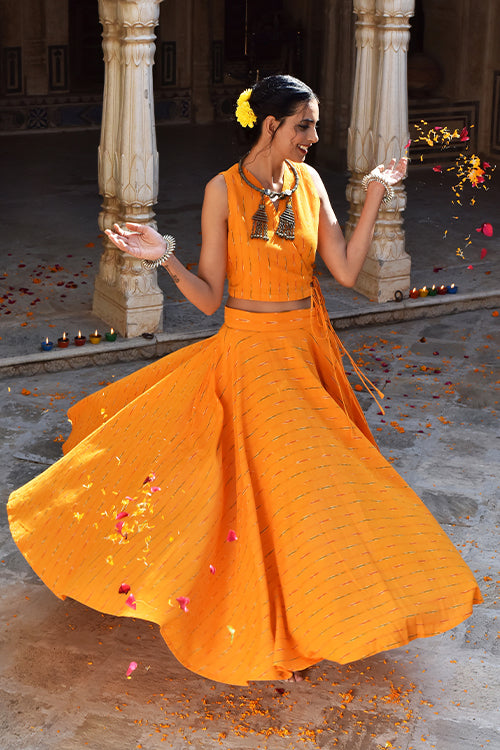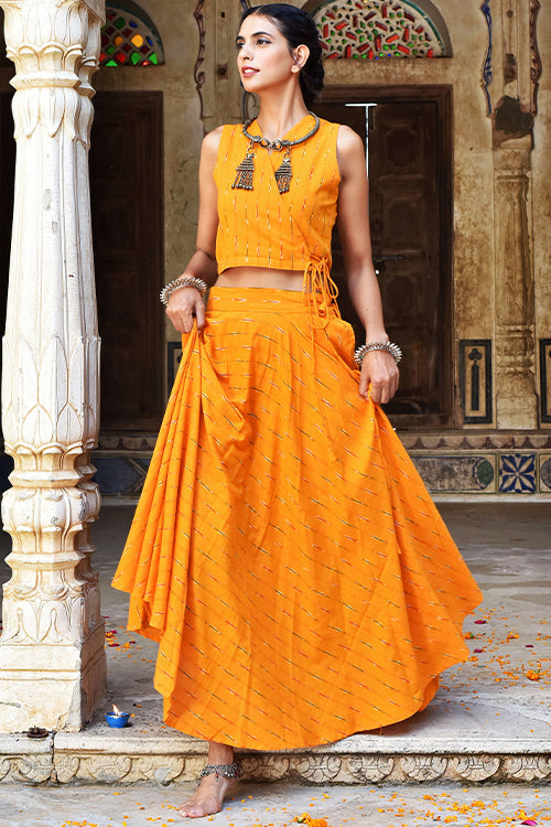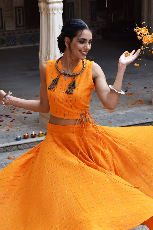 "Wrapped up in one delightful little package, we bring to you 'Katyayani' in the colour of worship, symbolizing energy and creativity. The glowing 2 piece ensemble comes with a versatile wrap top and a breezy long skirt to bring you into the festive mood. The most special feature of this sleeveless outfit is handcrafted with ikkat on a golden bell fabric to radiate the celebratory energy into the room! Relaxed and functional, the wrap top has fabric tassels at the drawstrings and the skirt, on the hand, comes with an elastic at the back and concealed pockets for your little girl to have a playful day. Layer the wrap top with a monochromatic dupatta for a more ethnic look or mix and match each of the pieces with contrasting colours, according to the occasion. "