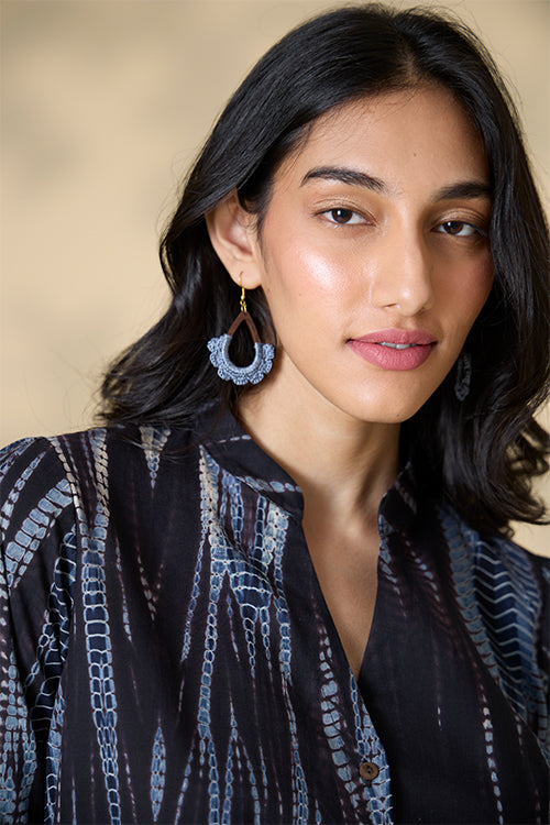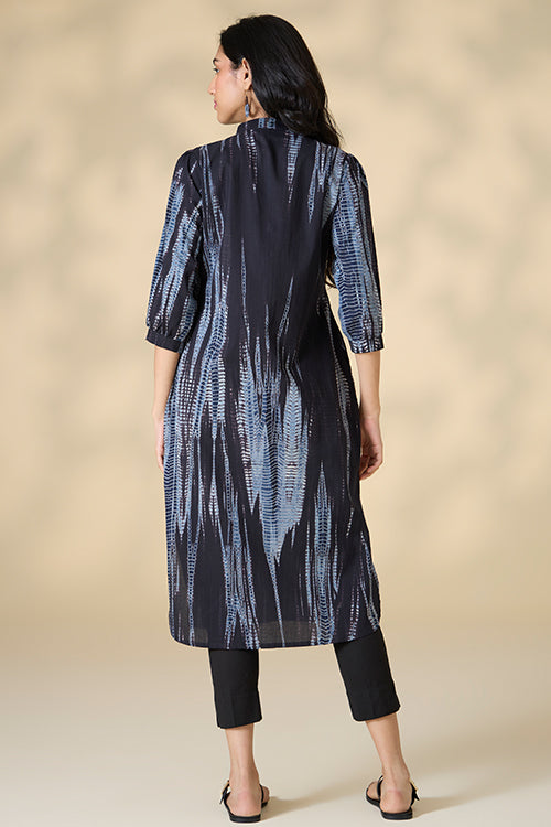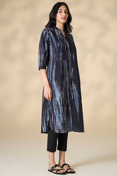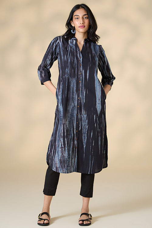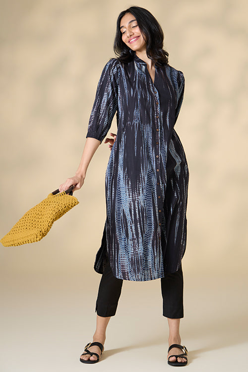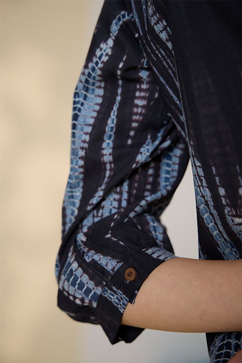 Step into sophistication with our "Magma" Kurta, crafted from pure cotton and adorned with a striking tie-and-dye print in stunning black hues. This kurta features a sophisticated stand collar and a functional front placket highlighted by wooden buttons. Each sleeve cuff is embellished with a single button, adding a touch of refinement. Gathers along the sleeve edges enhance its tailored look, while two side pockets offer practicality without compromising style. Perfect for both formal gatherings and casual outings, the "Magma" Kurta seamlessly combines craftsmanship and comfort, making it a versatile addition to any wardrobe.