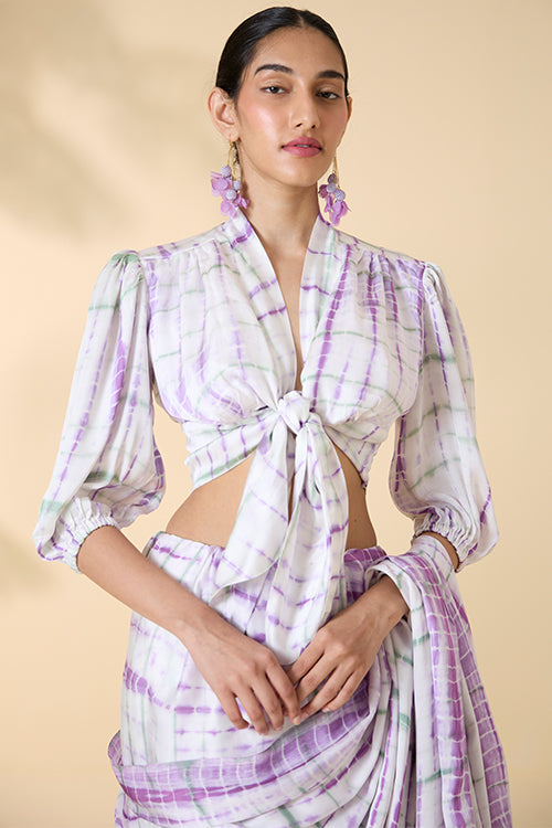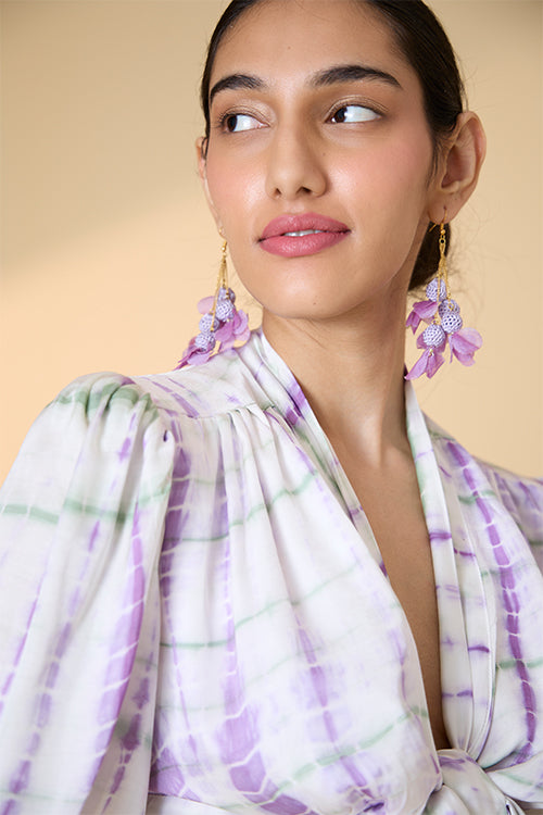 The art of tie-and-dye gets a playful revamp in our "Margarita" Top! Handcrafted from pure silk fabric, this short top comes lined underneath with soft mul fabric, excluding the sleeves. Tie it in the front to get that chic boho look. With vivid dyed patterns running through, this top comes with elastication on the edge of the sleeves. Wear it with your favourite pair of shorts, some flip-flops, statement earrings and be carefree but in style!