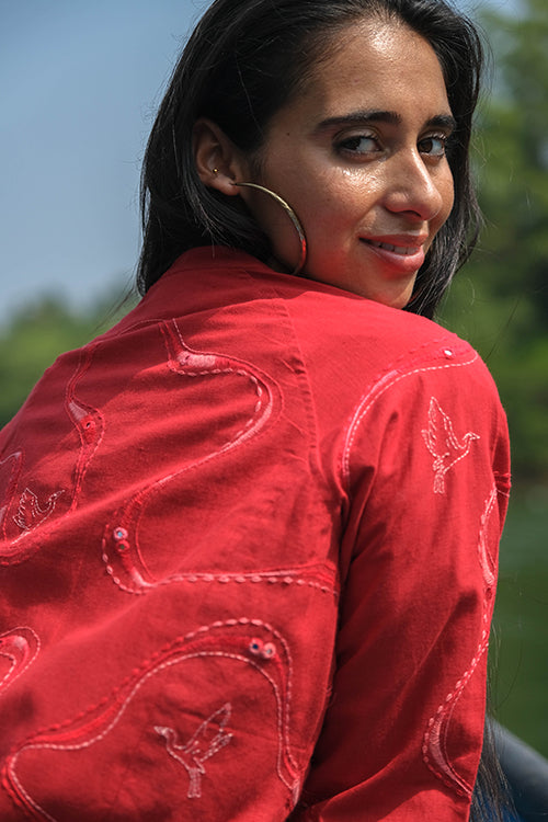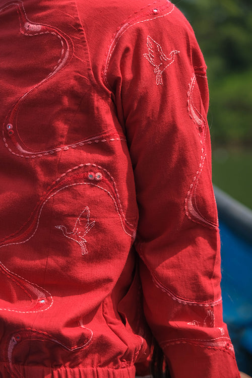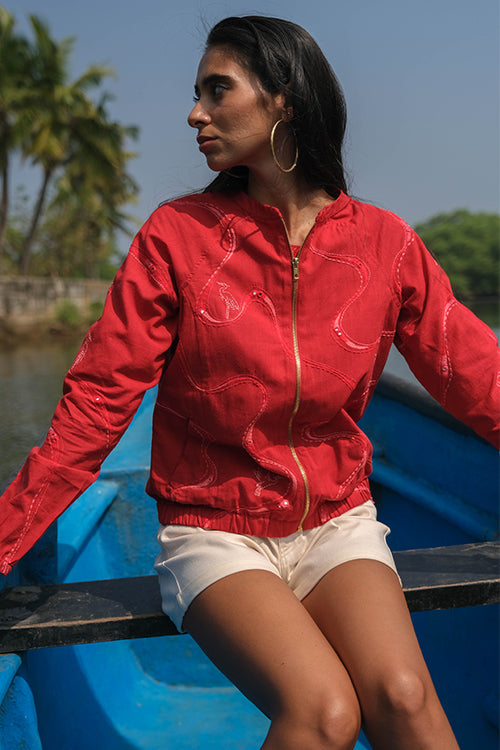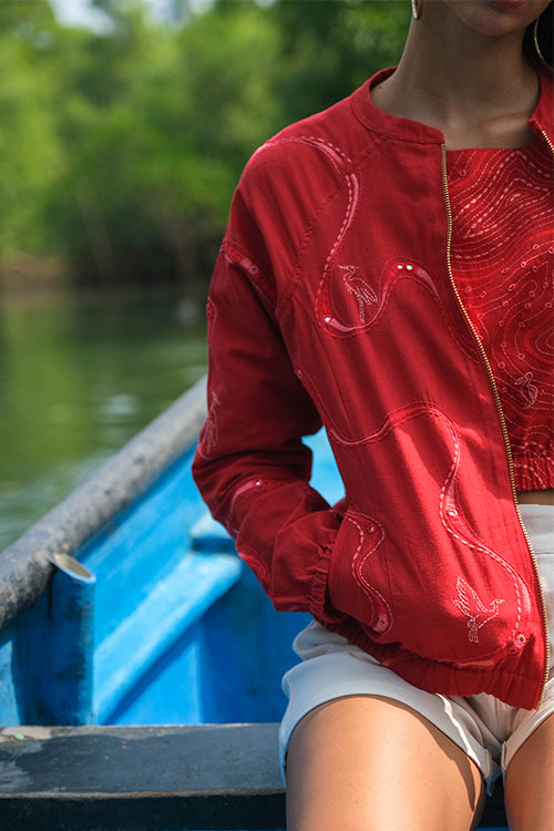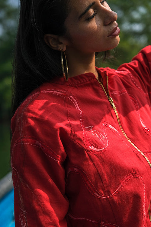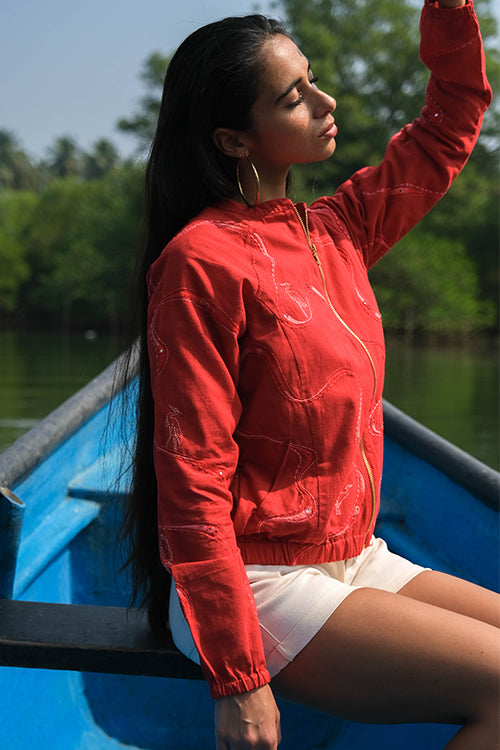 A touch of summer and class in the same fabric. Made up of soft cotton fabric, 'Maritime' is a versatile bomber jacket that is sure to strike a chord with all. Crafted with a central functional zipper, it also comes with two pockets in the front. The abstract pattern created out of satin, running, stem, french knot, lazy daisy stitches and mirrors along the front and back of the piece symbolise serene ocean waves. Maritime is well-designed to offer you the perfect fit every time. A perfect example of timeless style, this uniform will become your go-to wardrobe staple! Pair it with a bold necklace and earrings for a look that's completely you.