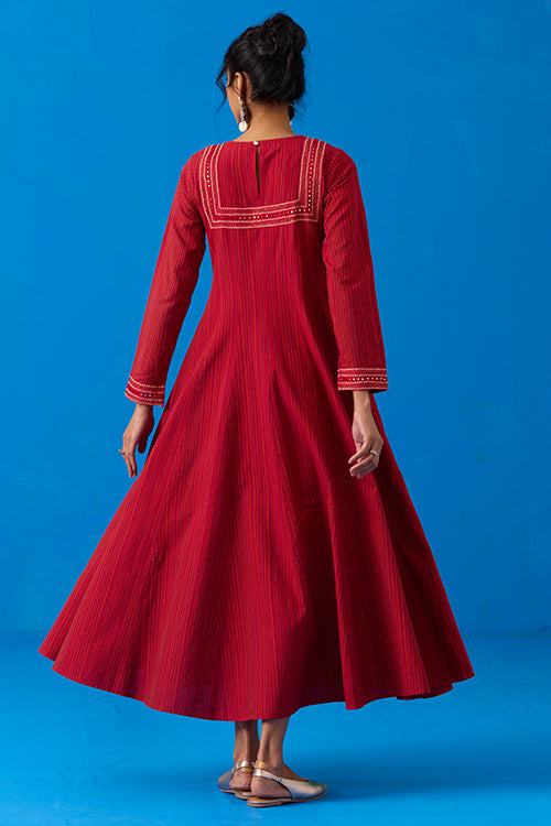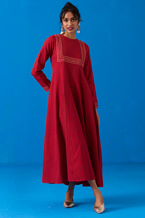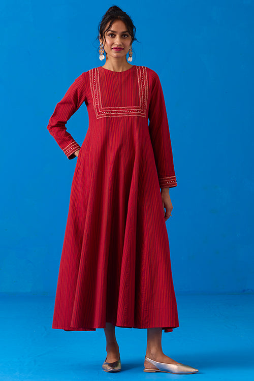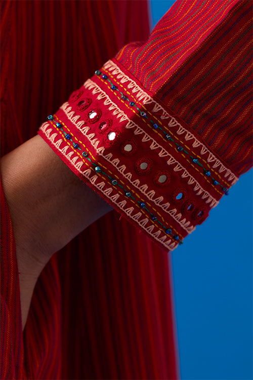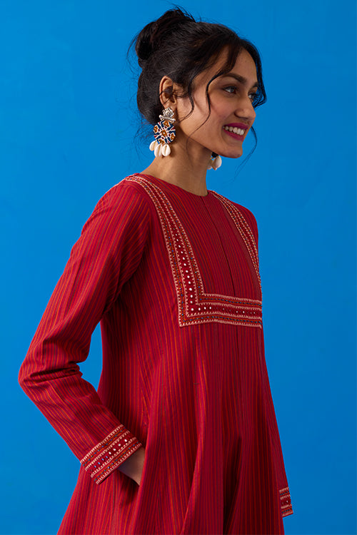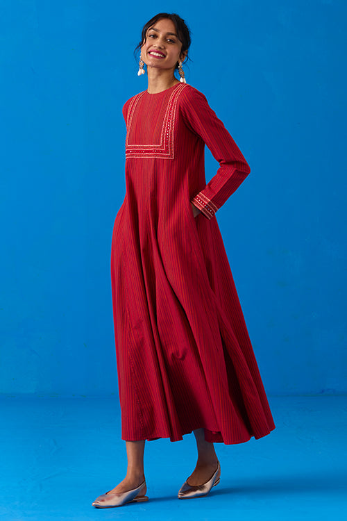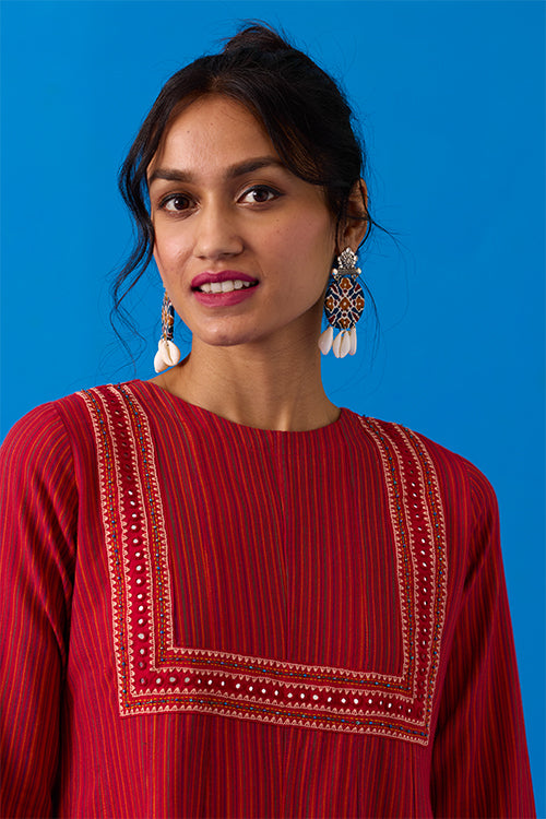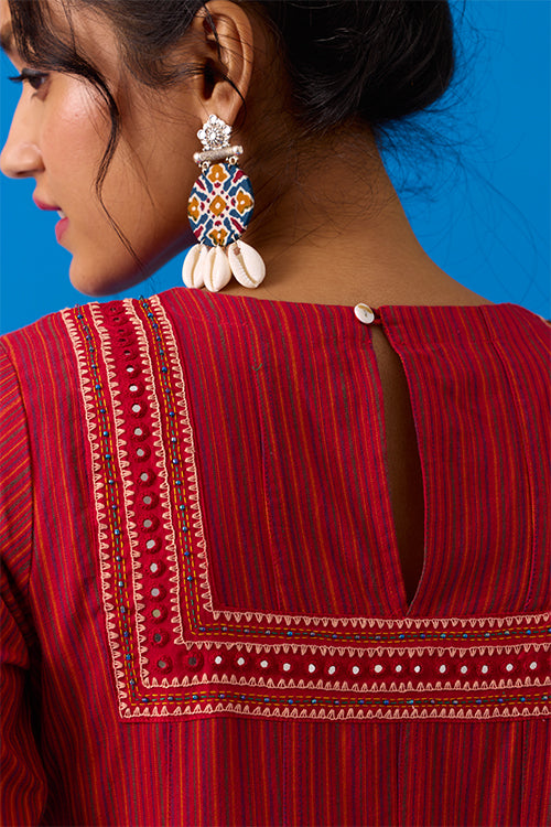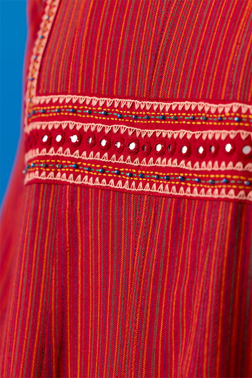 Bold yet timeless, the “Raging Semal” Dress captures the fiery beauty of maroon-red Ikkat in pure cotton. Intricate hand embroidery, shimmering mirrors, and delicate beadwork add a layer of artistry, transforming this piece into more than just a dress—it’s a statement. Designed with practicality in mind, it features two pockets for everyday ease. Style it with statement earrings and block-heeled sandals to create an ensemble that’s equal parts striking and sophisticated, perfect for any occasion.