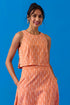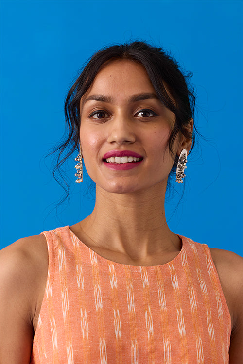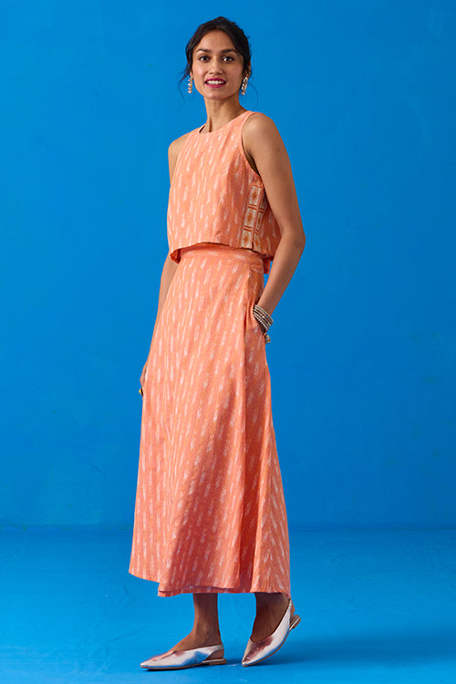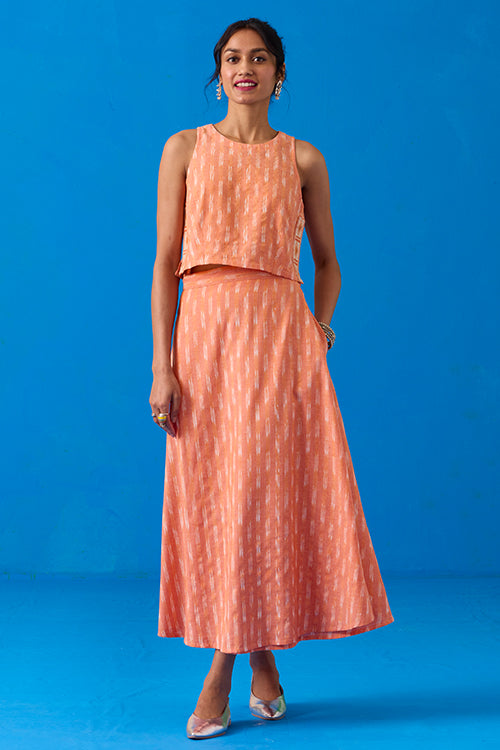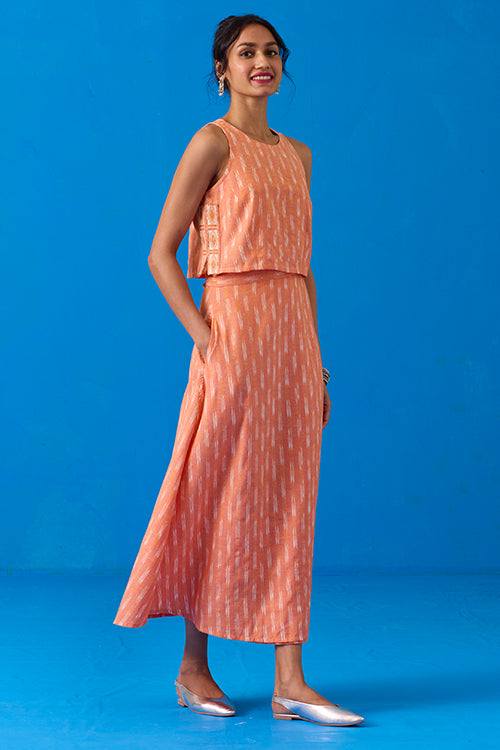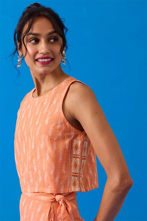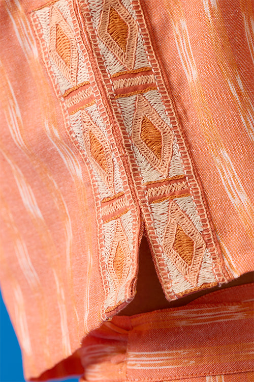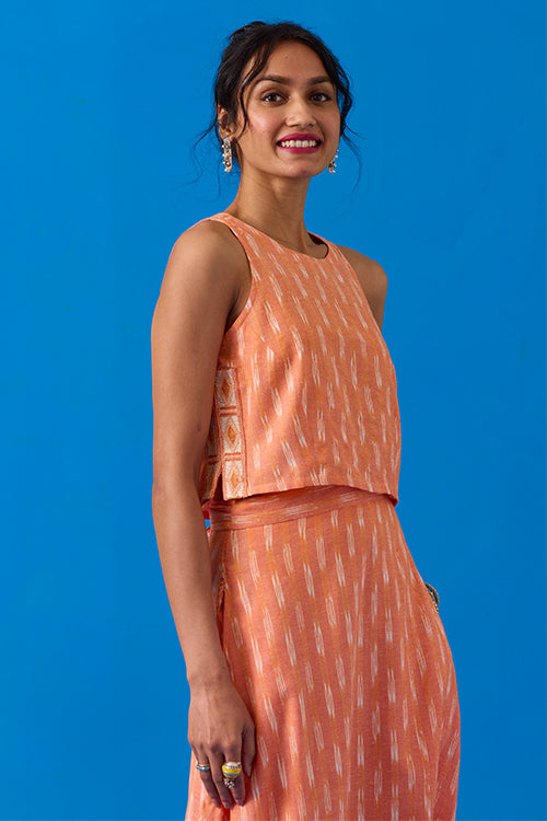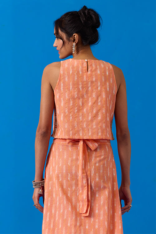Softly and in sheer elegance,step in the "Apricot" Ikkat Top in peach pure cotton - a beautiful blend of simplicity and intricate craftsmanship. The sleeveless design offers comfort and ease, while the embroidered patches along the front and back side seams, with satin, chain, and buttonhole stitches, add depth and detail. Finished with a MOP button and loop closure at the back, this top is both refined and versatile. Style it with the "Renewal" skirt for a co-ord day look or tuck it into high-waisted trousers for a chic, evening-ready ensemble.