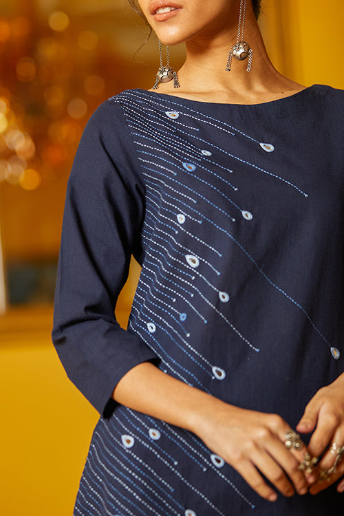 When the monsoon season meets the festive season, a special collection is born! Our ‘Baarish’ kurta-pant set made from pure cotton is like wearing art. The diagonal running stitch embroidery depicts the falling rain and if you stare at the little mirrors long enough, you can almost hear the pitter-patter of the raindrops pelting on your window. The kurta has two pockets and the pant has one. Straight-cut pants give the outfit a contemporary twist. Wear this beautiful kurta for Diwali function with your family and go heavy on the jewellery. It is Diwali after all! You deserve to look your absolute best!