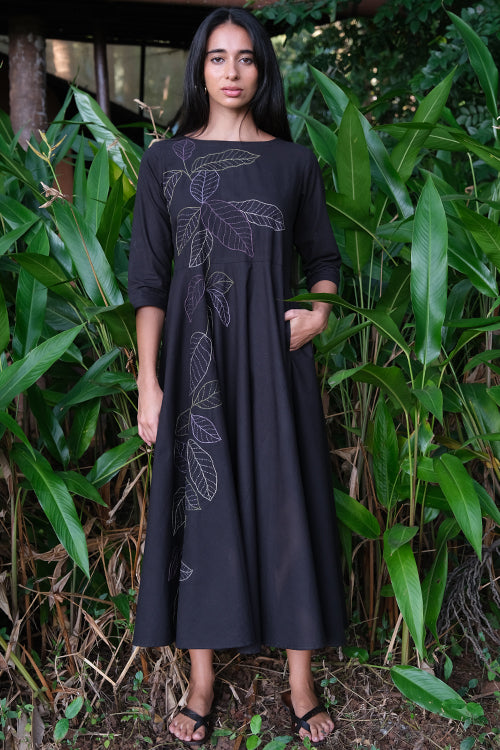 Black is the ultimate epitome of beauty. And so is floral work on a piece of garment. The amalgamation of two creates art! That's what our 'Black Energy' speaks of. A beautiful fit and flare dress with comfortable lining inside, is adorned with stunning leaves all over the front stretching up to the back of the dress. Extra belt and shoulder press buttons assure your utmost comfort. Pair it with stilettoes and statement jewellery, and you'll be good to go!