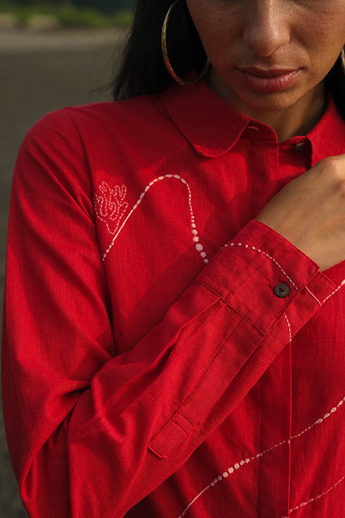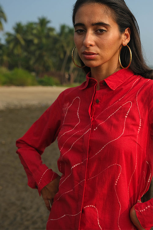 For those who look for style and comfort in one shirt, our 'Briny Deepi' is an apt choice. It is hand embroidered with running, satin, lazy daisy, french knot and stem stitches, which make the waves look so real that it seems like they are going to flow along the shirt. Crafted from 100% cotton and with a soft feel, this red shirt will be an instant favourite. Its full sleeves make it suitable for all seasons, whether you are heading out to meet friends, working in the office, or going on a picnic with the family.