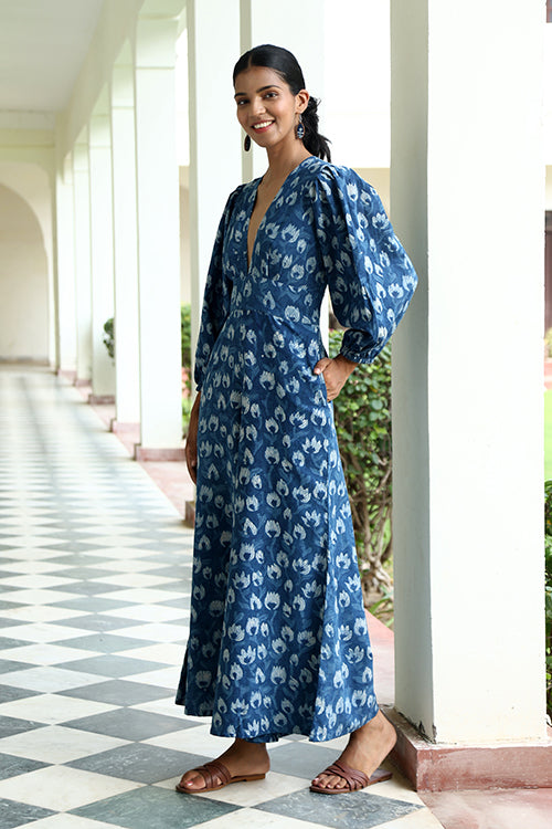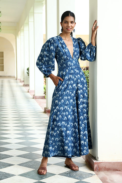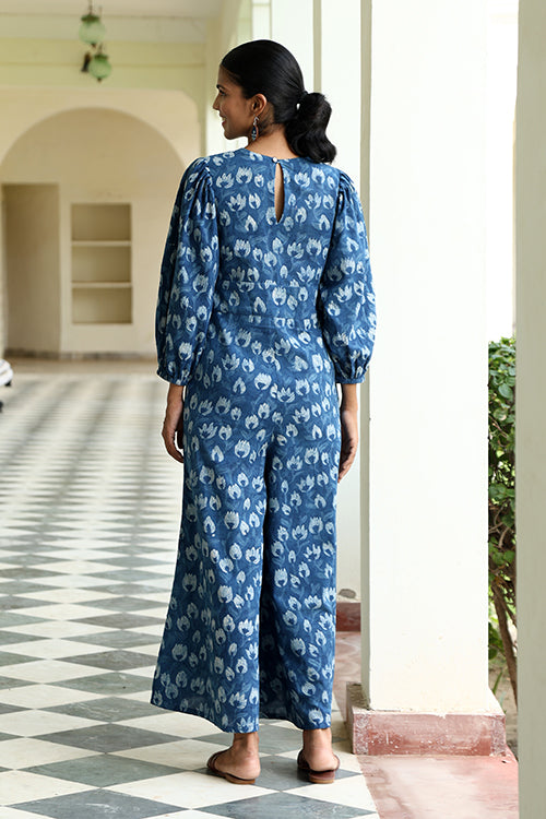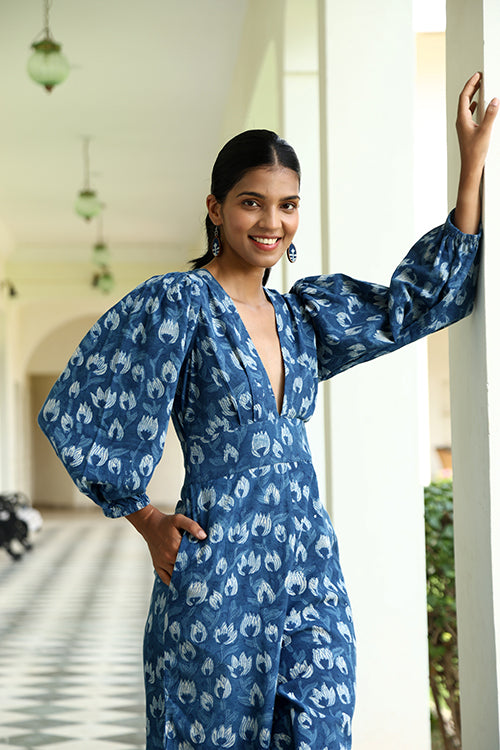 Introducing the "Delphini" jumpsuit – a perfect blend of elegance and practicality. Handcrafted from pure cotton, this jumpsuit showcases a brilliant indigo color adorned with exquisite handblock printed motifs, adding a unique artistic touch. The elasticated sleeves provide a comfortable fit, while the concealed zipper on the side ensures a seamless look. At the back, a Mother of Pearl button adds a touch of sophistication for closure. Designed with your convenience in mind, the "Delphini" features two handy side pockets, making it as functional as it is stylish. Embrace the chic, smart, and sophisticated appeal of the "Delphini" jumpsuit, perfect for any summer occasion.