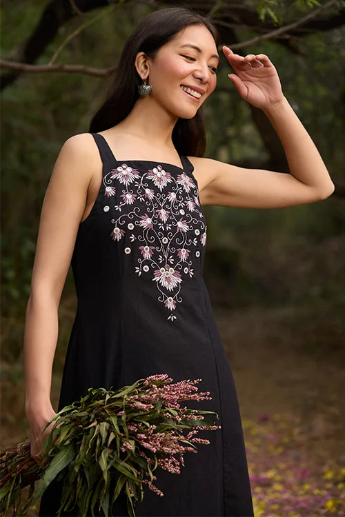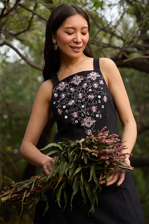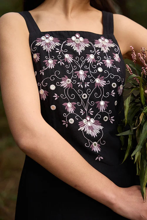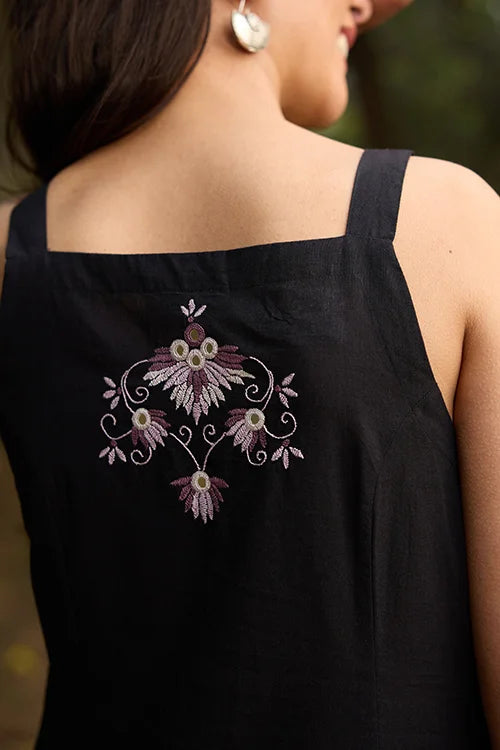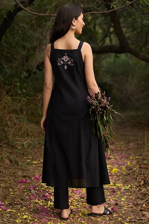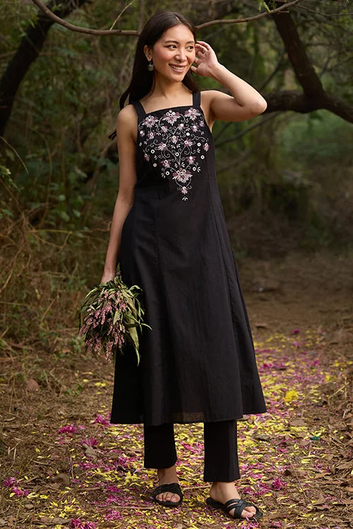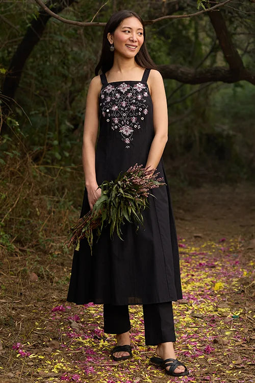 A touch of midnight mystery, the Florence set is elegance and effortless ease combined. Crafted from pure black cotton, it drapes like a quiet evening breeze—light, breathable, and endlessly graceful. The kurta, with its thick straps and hand-embroidered details, is adorned with satin and stem stitches, framing tiny mirrors that catch the light like fireflies at dusk. With two hidden pockets, it brings both function and charm. The matching pants, designed for comfort with an elasticated back, move with you through sunlit strolls and moonlit gatherings alike. Style it with silver jhumkas for a festive evening or slip into strappy sandals for a slow summer afternoon spent wandering through art-laden alleys.