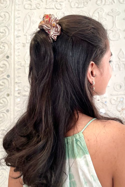 "Holding the hair tightly and being gentle on the hair strands, scrunchies are a must-have accessory that's making a comeback this season. It can be used to complete your daily casual look or for parties, whether it be a high ponytail or classic bun. Handcrafted from fabric waste, each scrunchie has its unique print. These vibrant scrunchies are the perfect way to jazz up your hairstyle. The soft and lightweight material won't tug your hair or make you feel uncomfortable while wearing it.