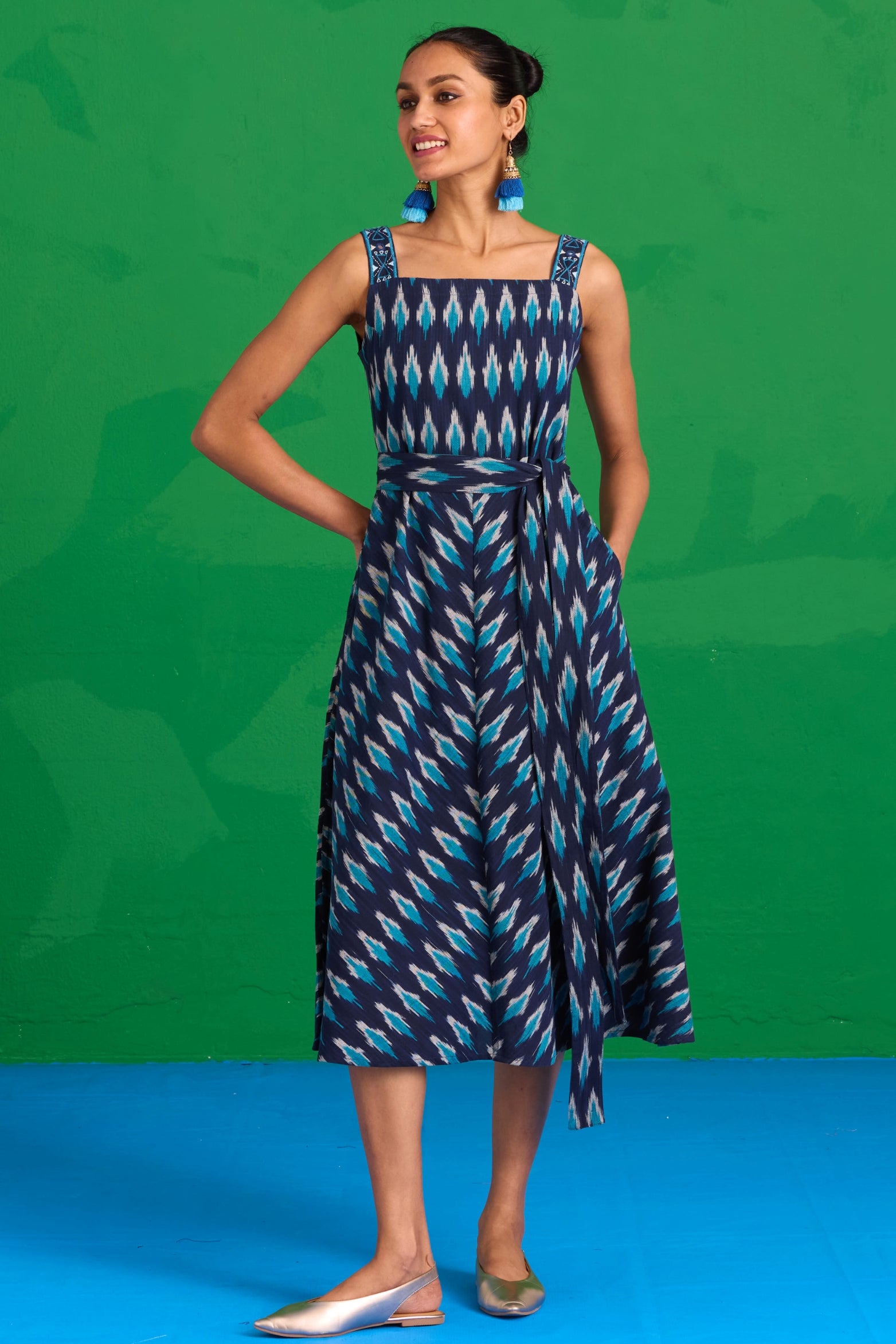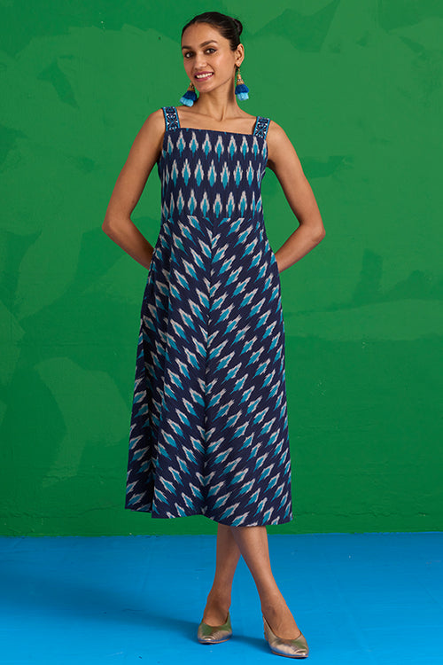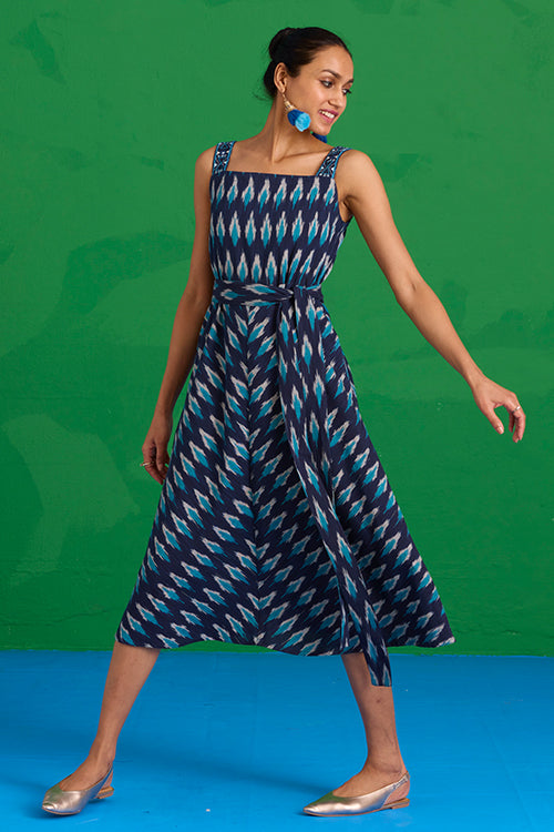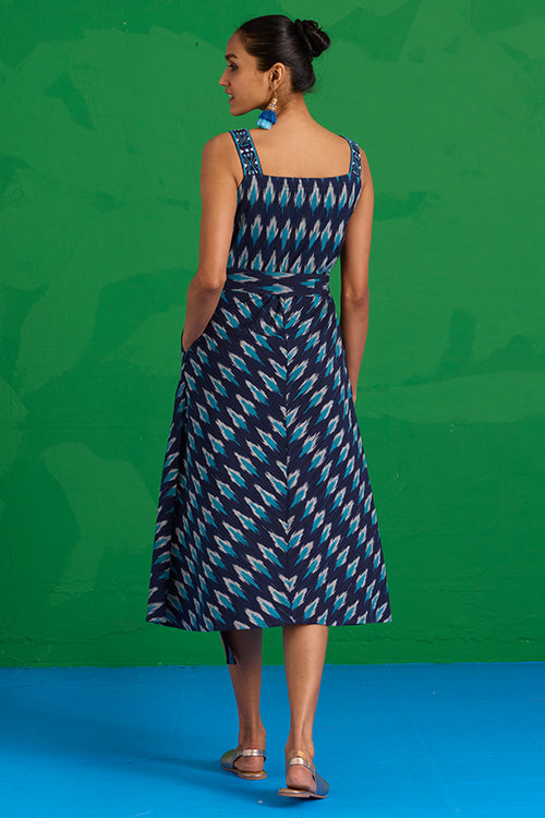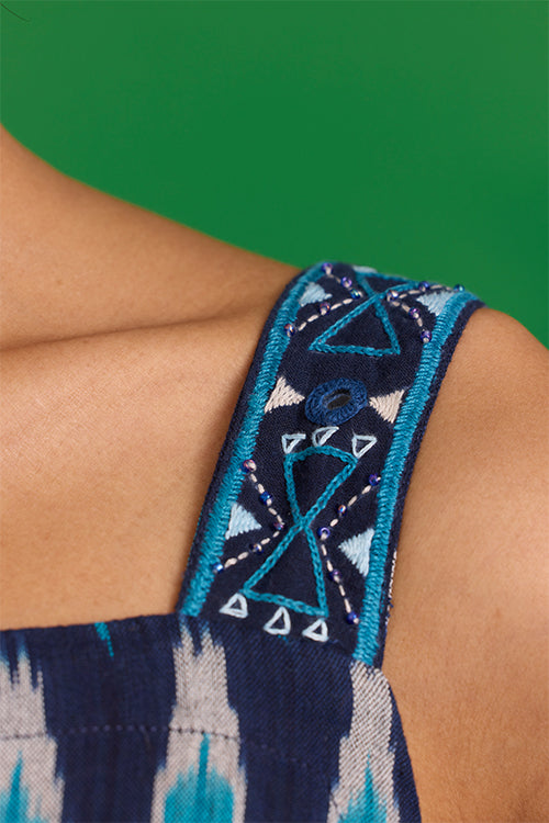 The “Lagunia” Sleeveless Dress is where artisanal detail meets effortless elegance. Crafted from pure cotton Ikkat in a striking blue, it features shoulder straps adorned with intricate hand embroidery, blue glass beads, and delicate mirror work. The A-line silhouette is thoughtfully accentuated by a center slit, where the Ikkat print aligns to form a perfect “A.” An external belt adds a customizable touch, while two pockets bring practicality to the design. Pair it with minimal jewelry and woven flats for a look that balances sophistication with ease, making every moment feel intentional.